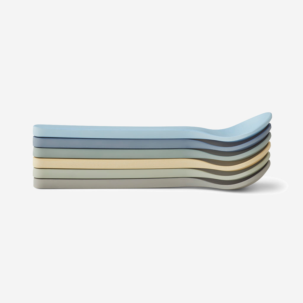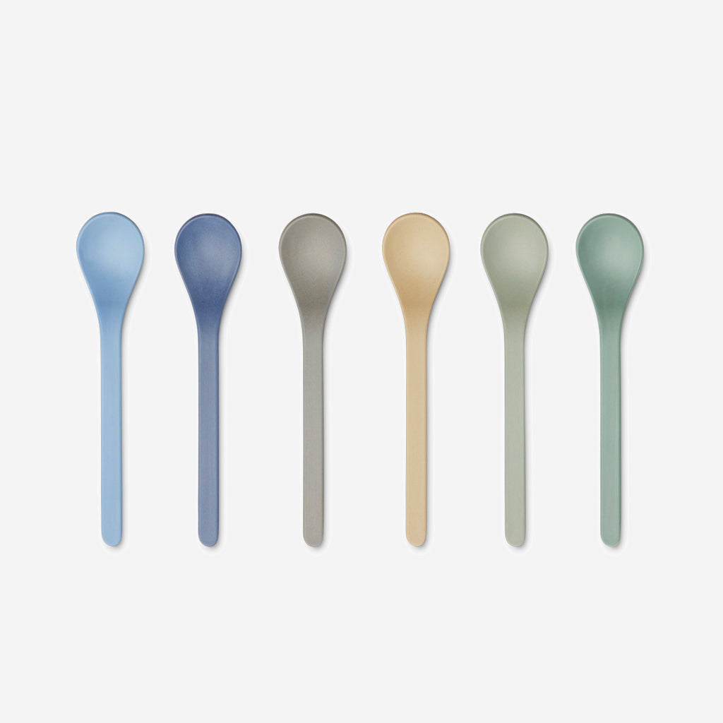 The Liewood Erin spoon pack in peppermint blue mix, comes as a set of six spoons – soft to the touch and a perfect addition to any tableware.