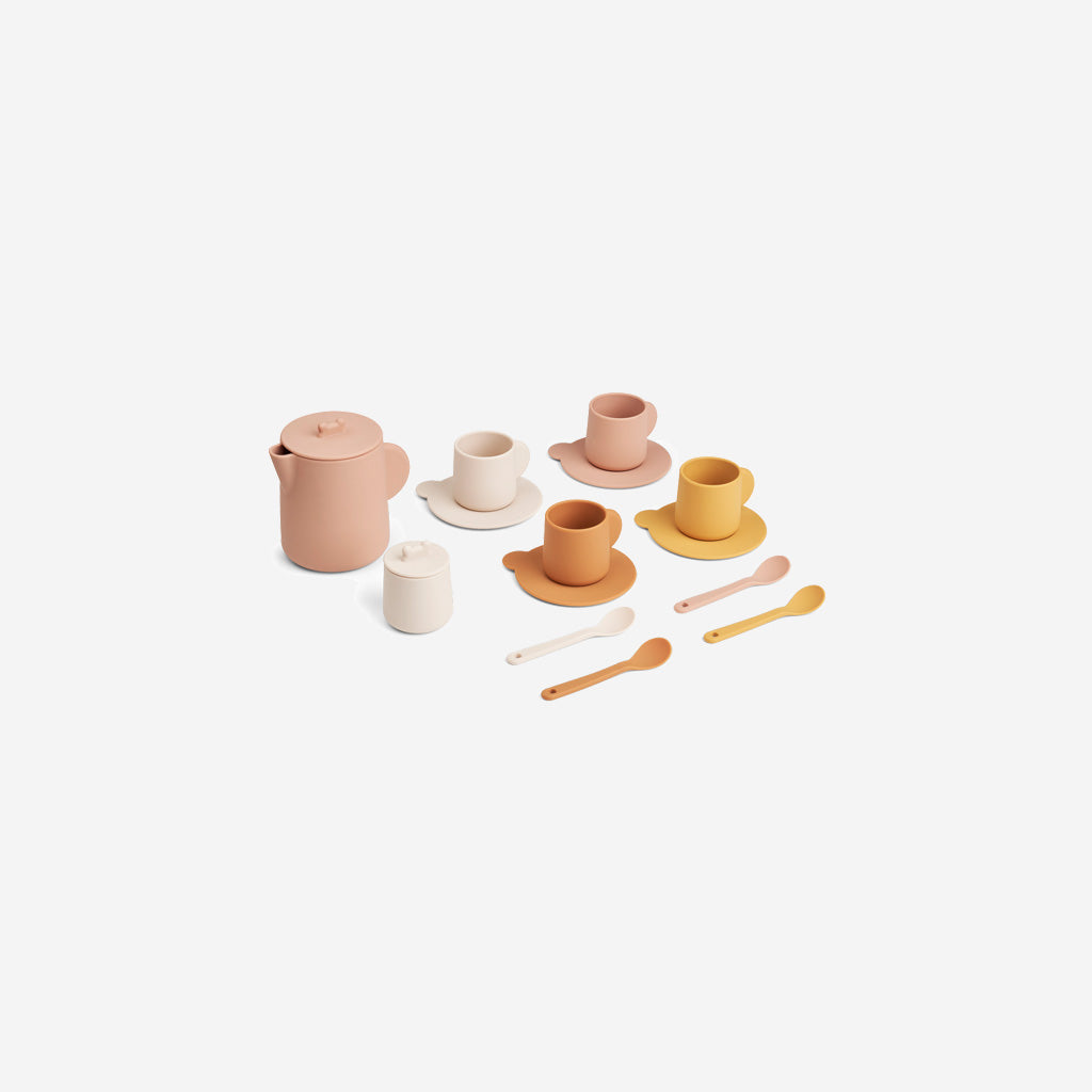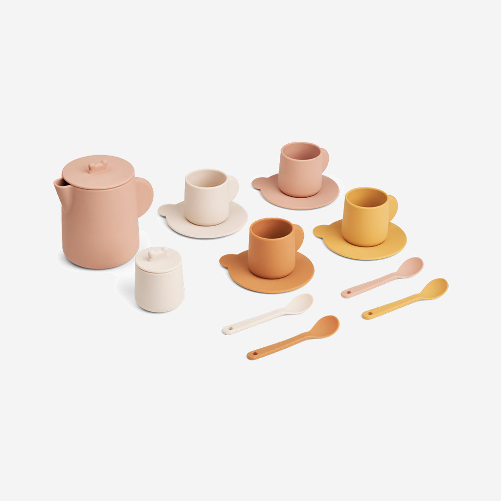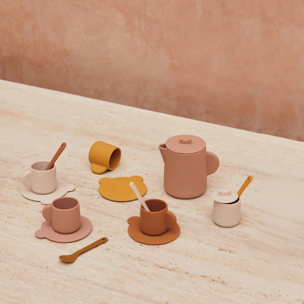 The Liewood Kourtney Tea Set in Rose is a silicone play set that encourages role play and helps children develop social skills and fine motor skills.