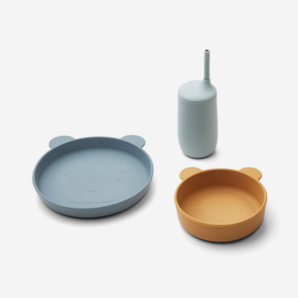 Liewood's best junior dining products in silicone - all in one convenient set. The Nathan Junior Dining Set is a great non-breakable alternative to plastic and porcelain. Set includes Olivia Plate, Vanessa Bowl & Dylan Cup.