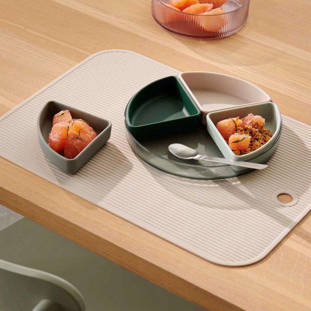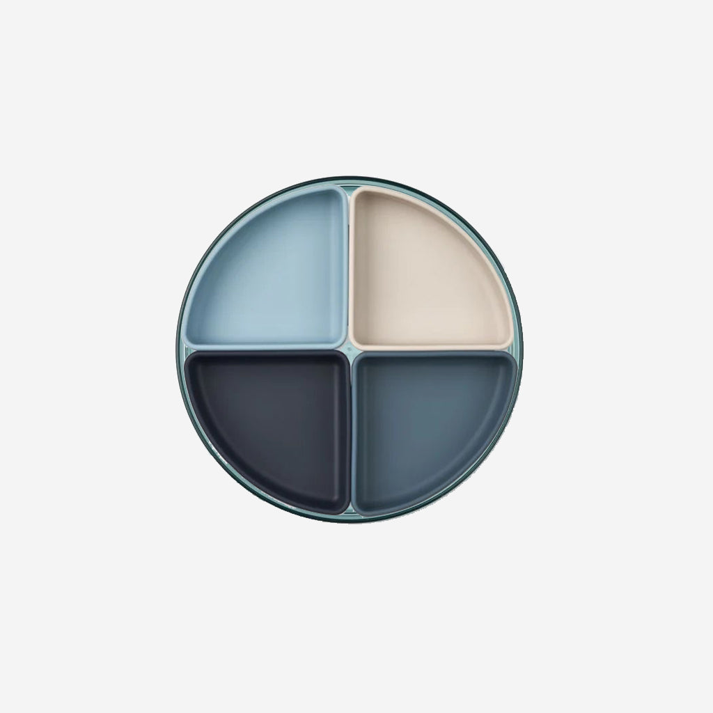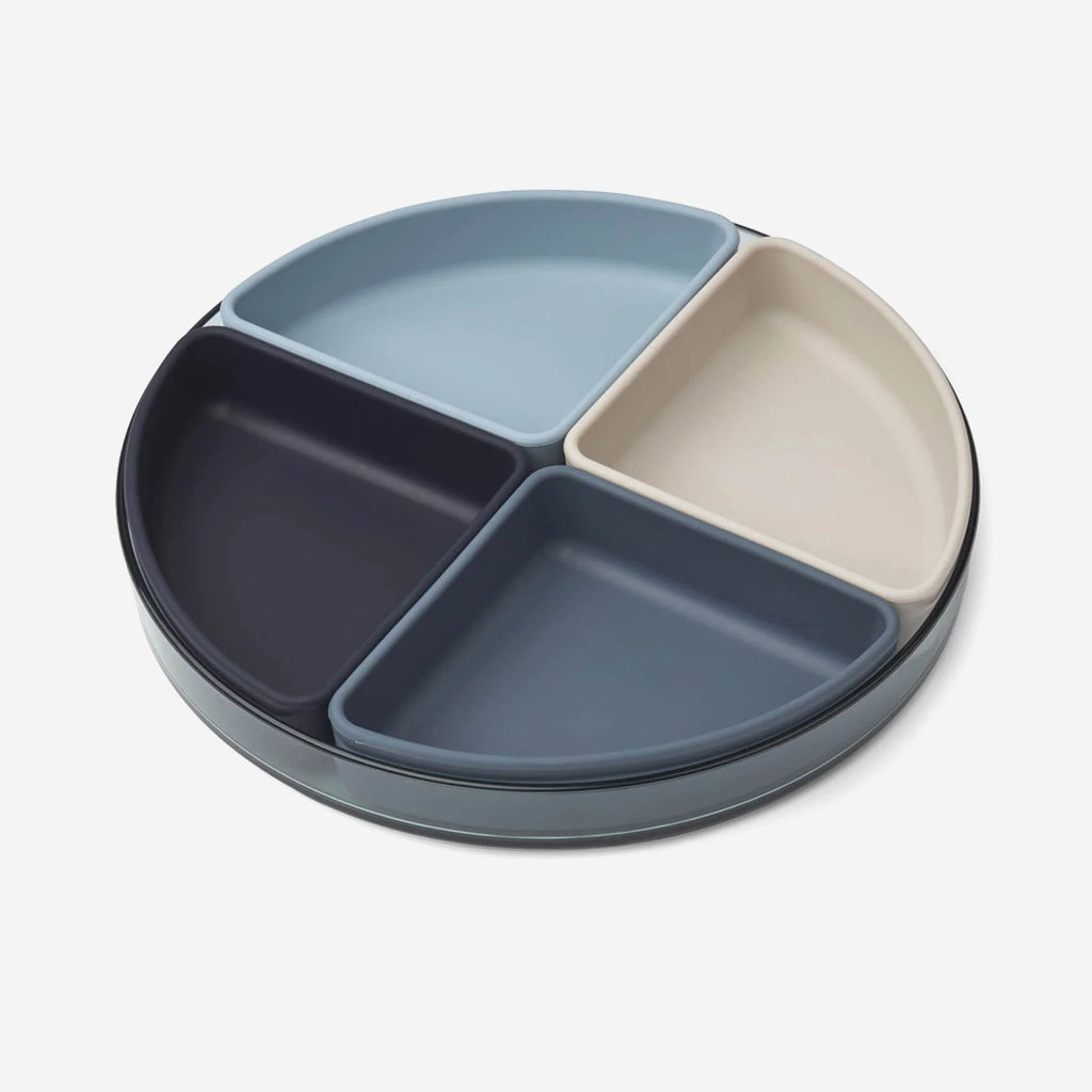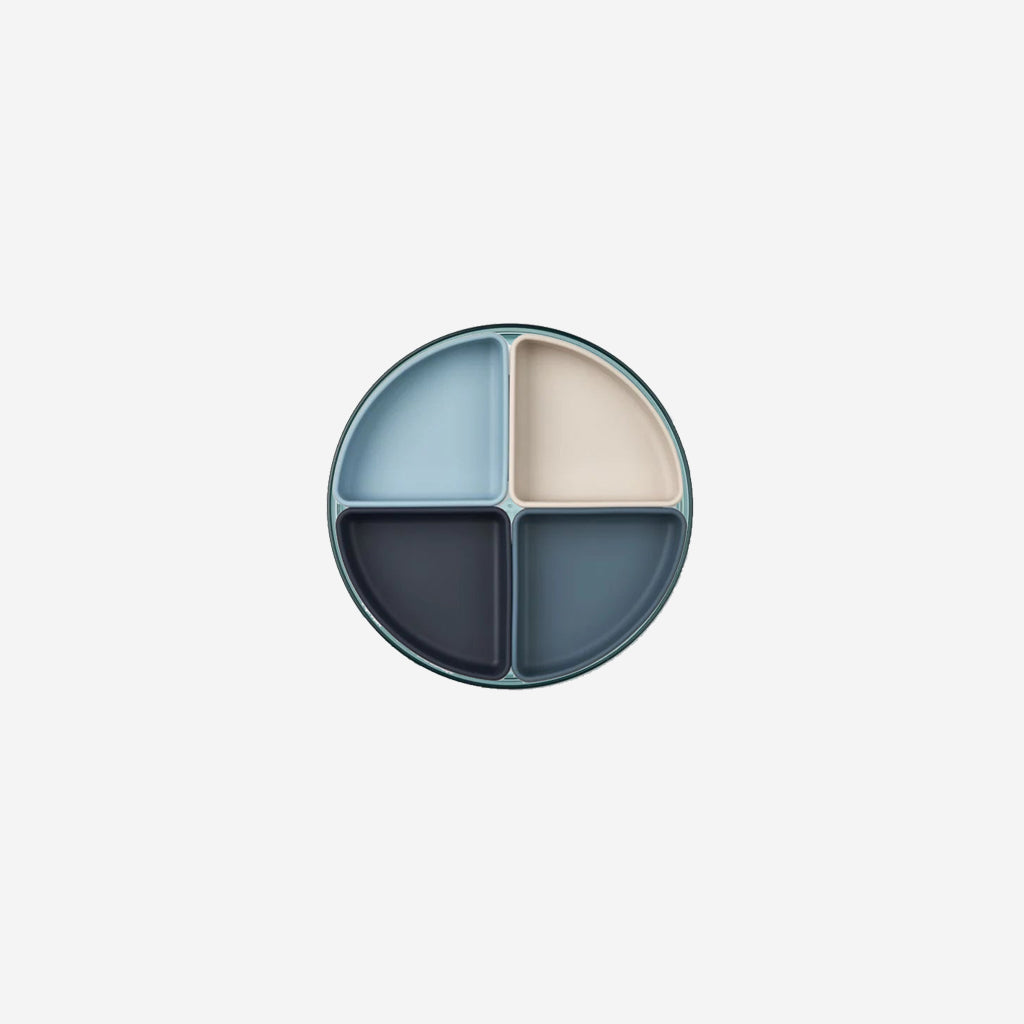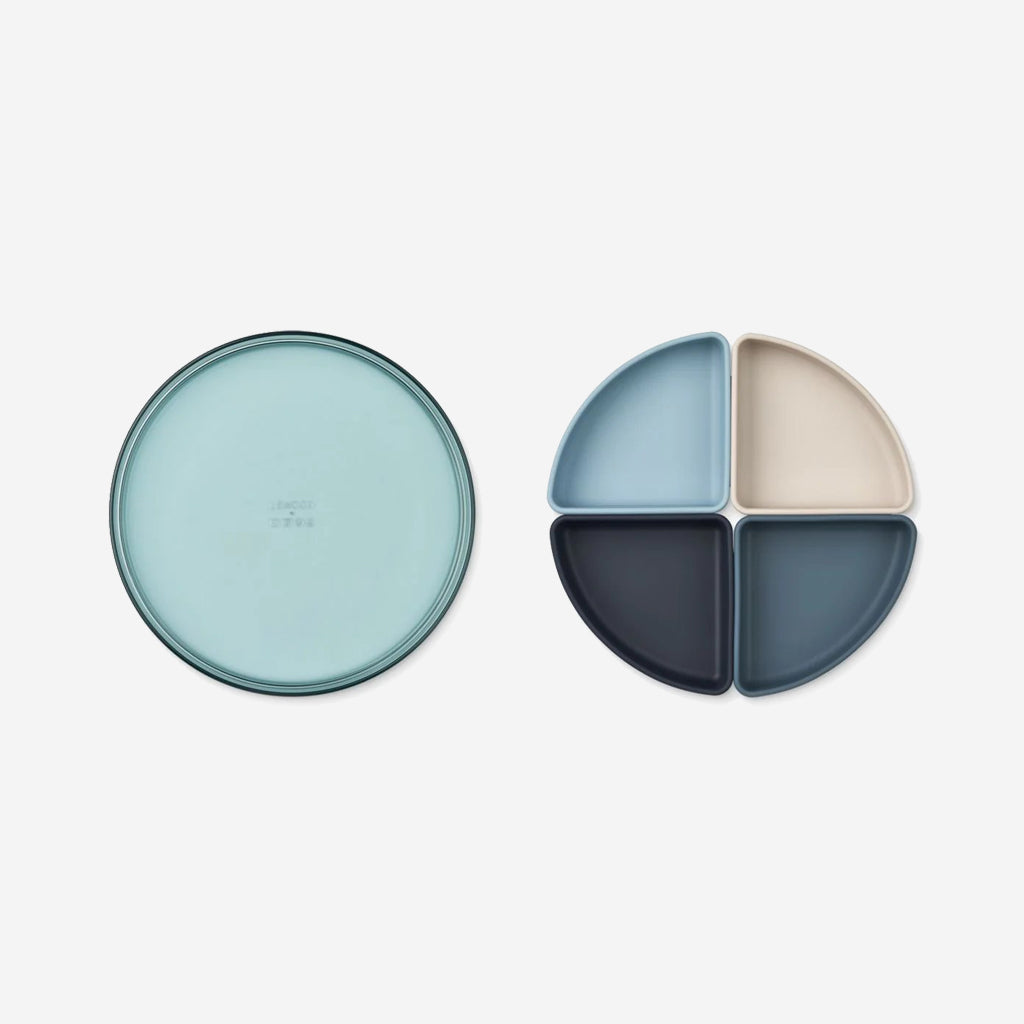 The Sea Blue Liewood Shawn Plate Set is a 5 piece divider plate with a base of a transparent tritan plate and additional 4 silicone inserts for snacks and small servings. Shawn comes in 3 colours to accommodate different colour schemes of your table setting.