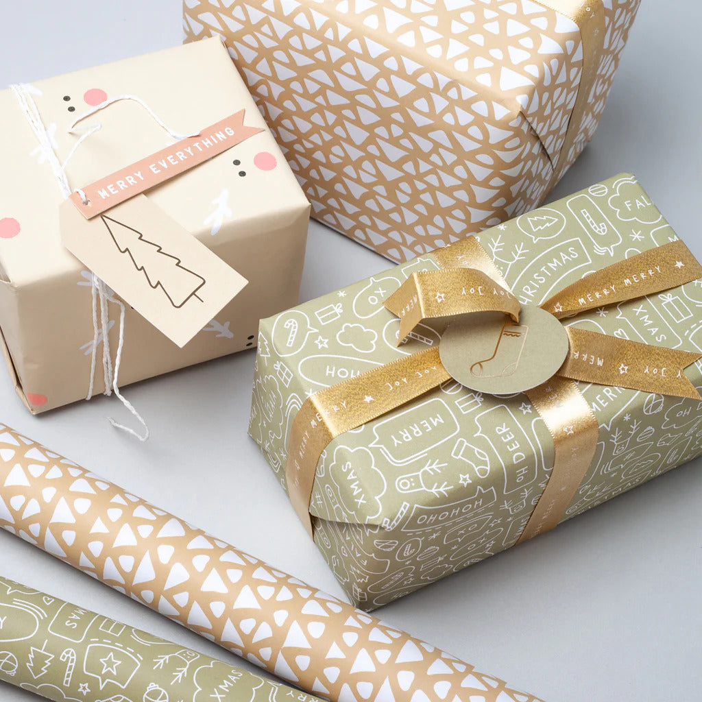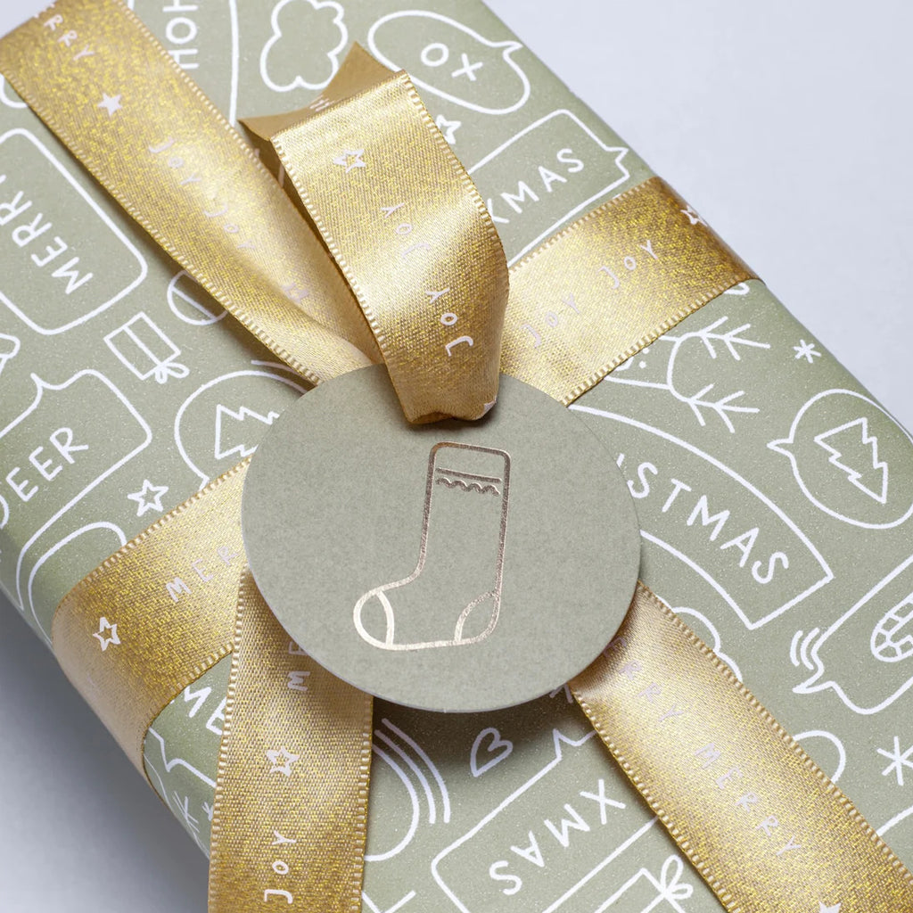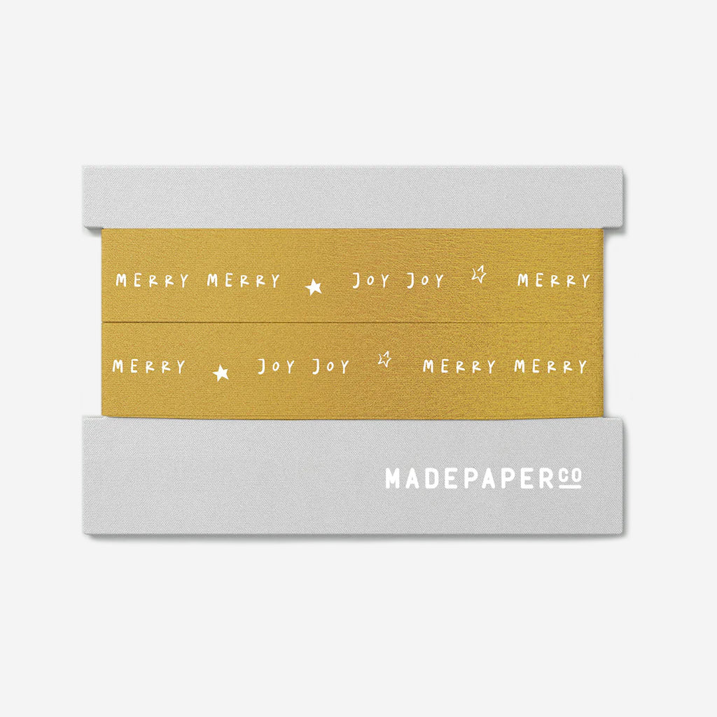 Merry Merry Joy Joy, this extra-wide gold metallic printed ribbon will have your gifts look extra-festive this Christmas.