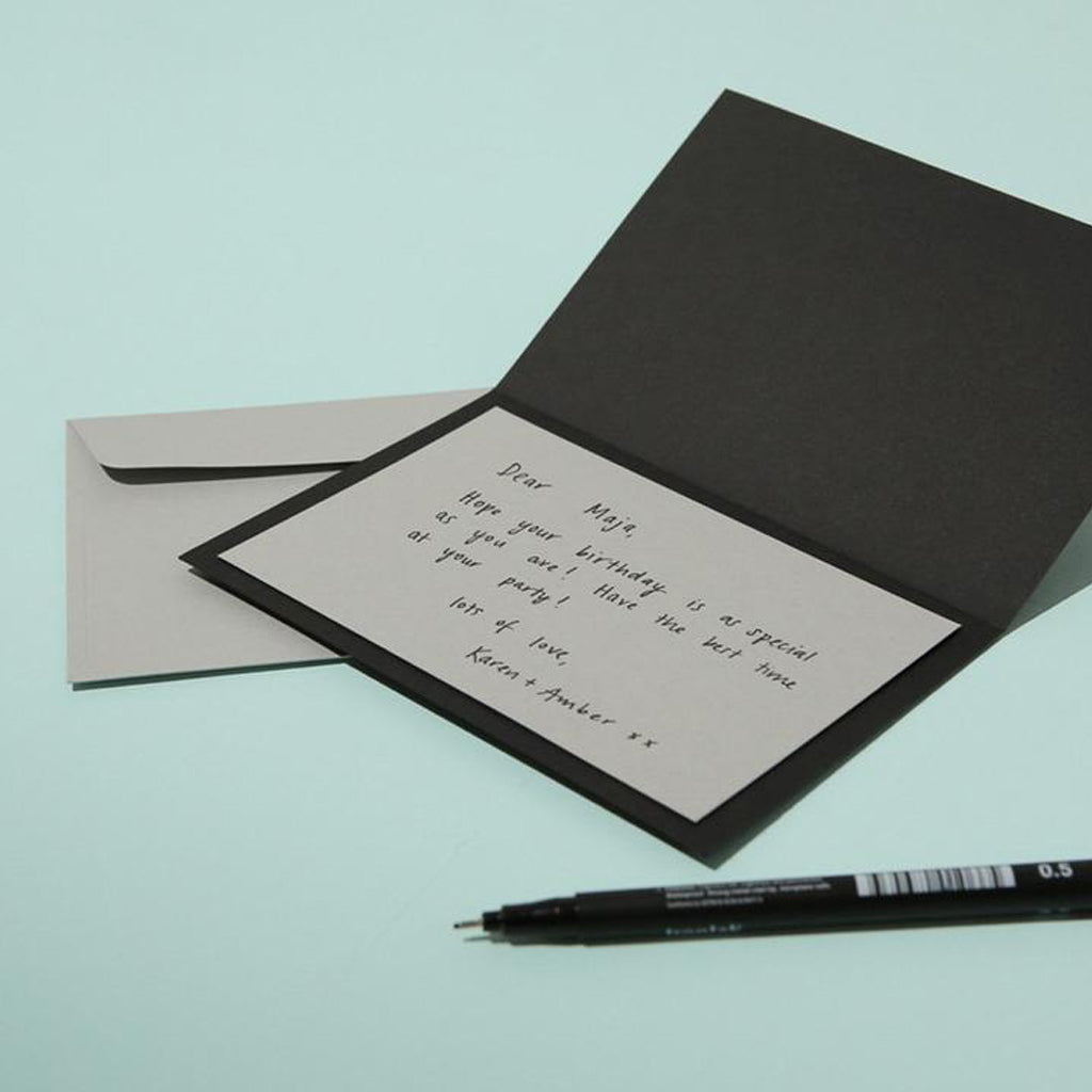 Colour : Black card, hand screen printed in silver. Grey insert for easy message writing - no need to use a white pen!