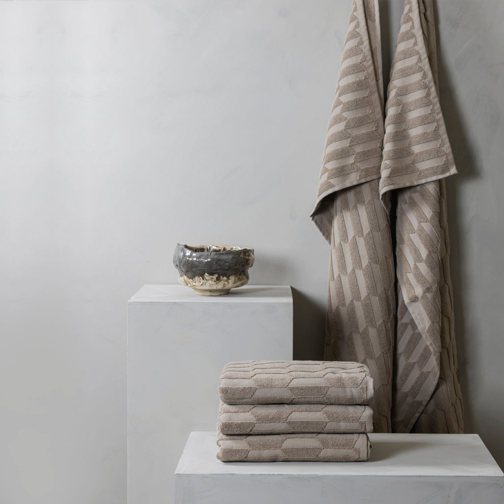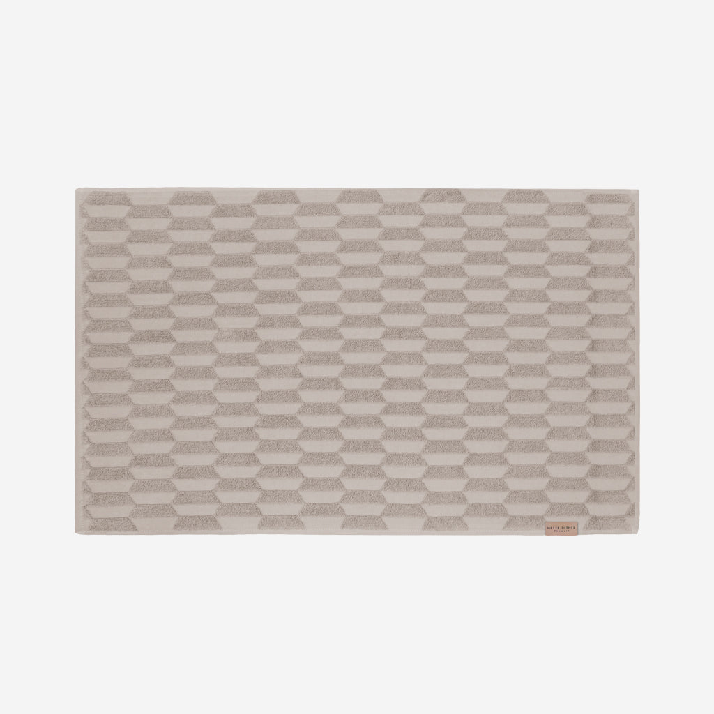 The Mette Ditmer Geo bath mats are made with a high-low weaving technique in which the hexagonal shape is split into two halves. It provides an almost three-dimensional, graphic pattern with a light and a dark half. The bath mat is made of 100% OEKO-TEX® 100 certified cotton, which gives a unique softness and good absorbency.