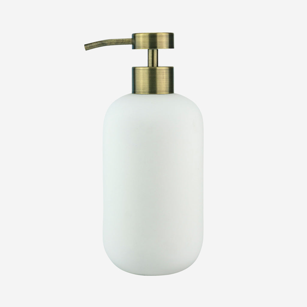 Elevate your bathroom with Mette Ditmer's Lotus tall soap pump in white The matte rubber coated ceramic and soft curved design will add a touch of elegance to any bathroom aesthetic. Complete the look with the matching dispensers in the same series.