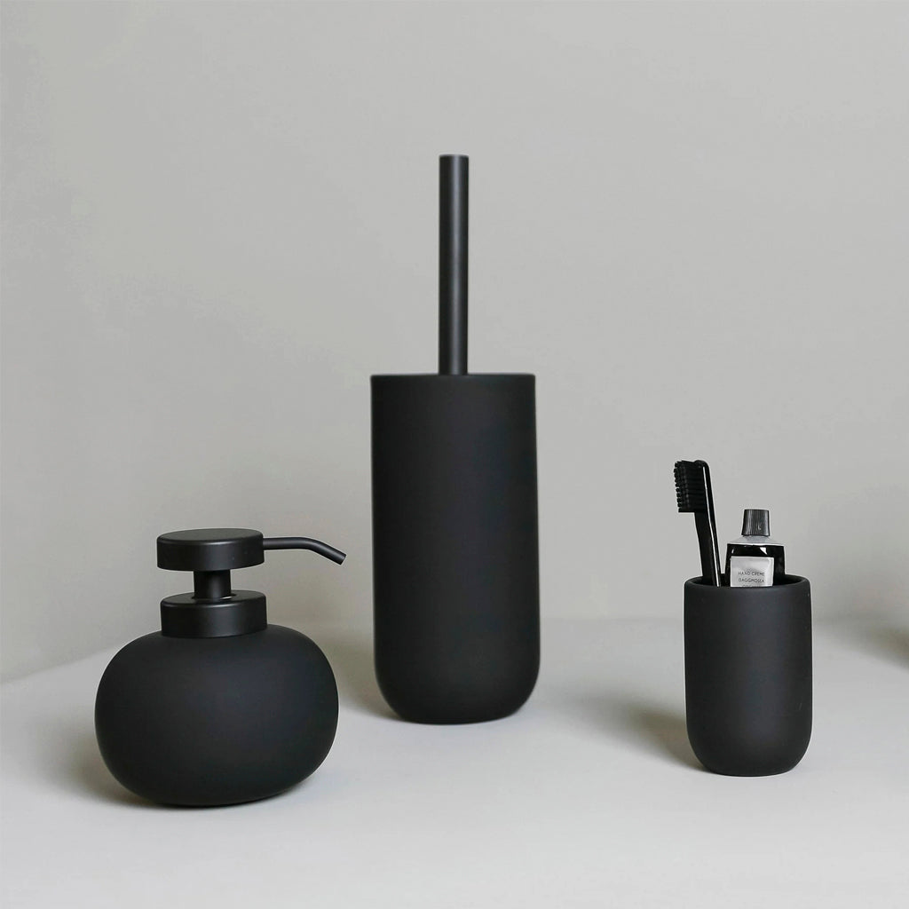 Elevate your bathroom with Mette Ditmer's Lotus toilet brush in black. The matte rubber coated ceramic and soft curved design will add a touch of elegance to any bathroom aesthetic. Complete the look with the matching dispensers in the same series.