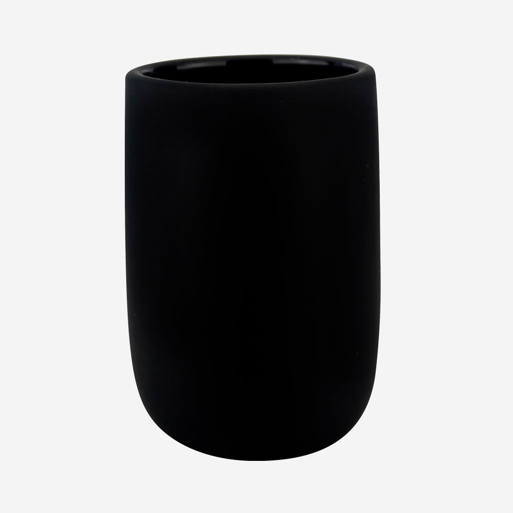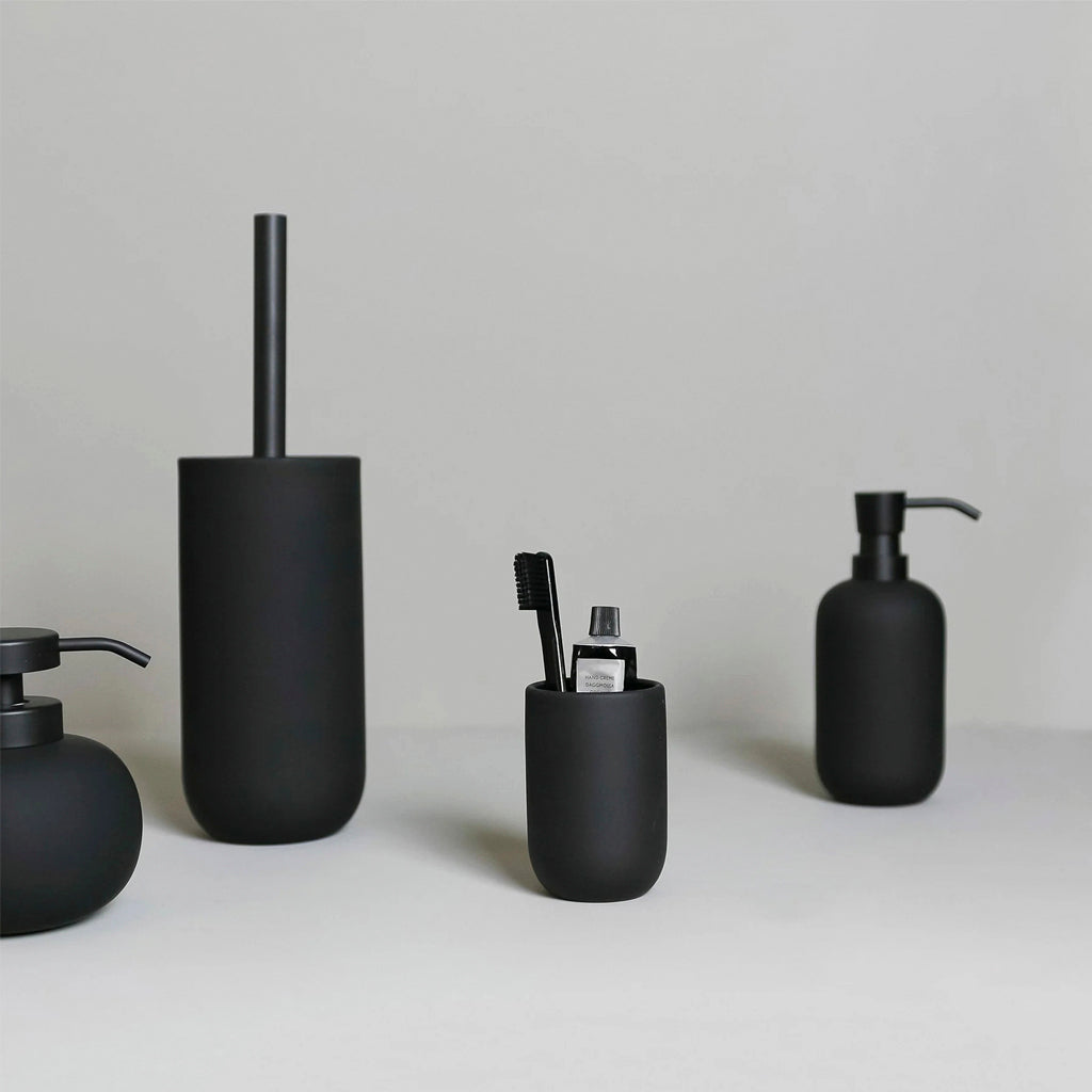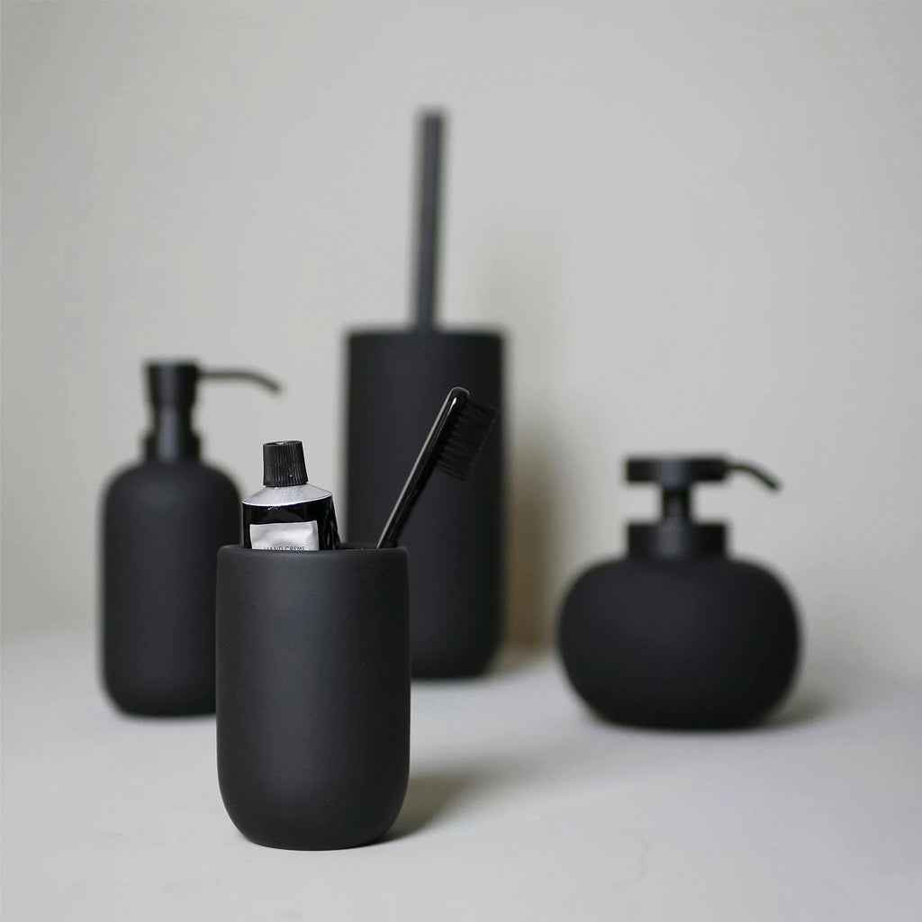 Elevate your bathroom with Mette Ditmer's Lotus tumbler mug in black. The matte rubber coated ceramic and soft curved design will add a touch of elegance to any bathroom aesthetic. Complete the look with the matching dispensers in the same series.