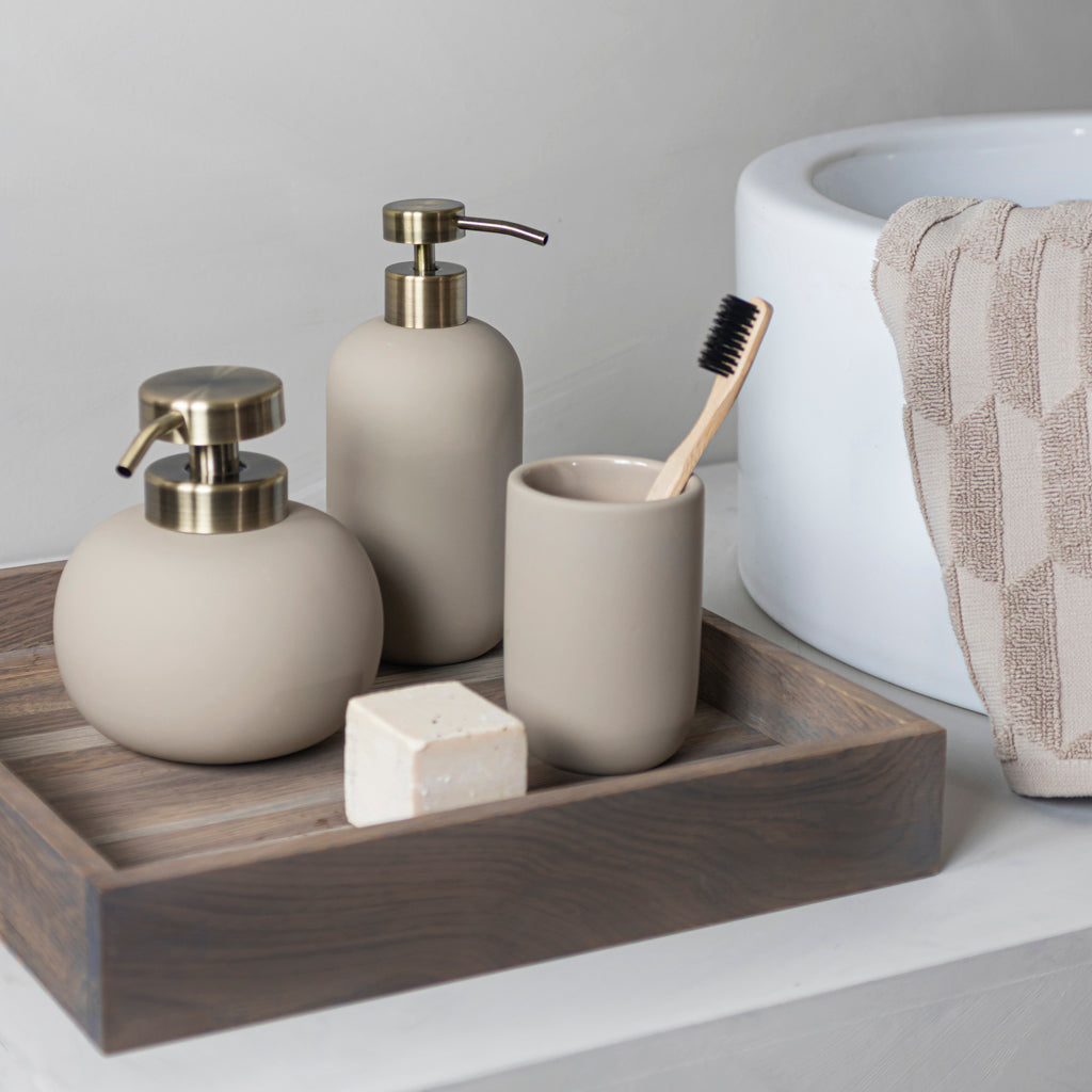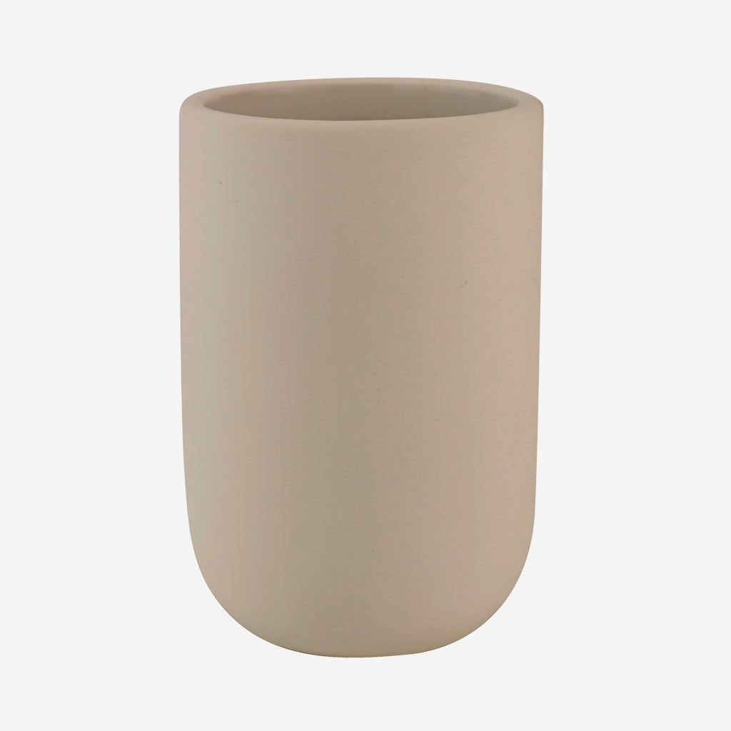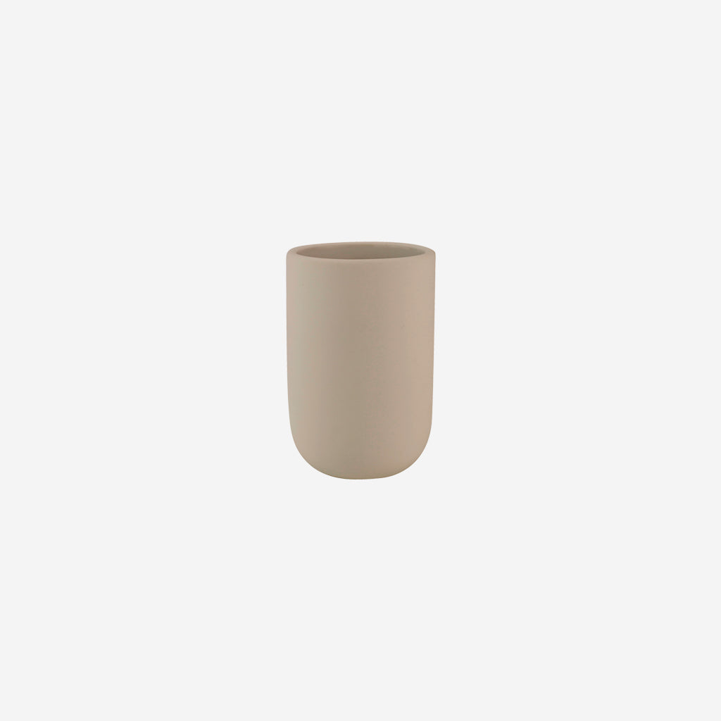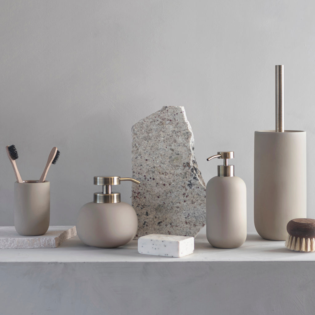Elevate your bathroom with Mette Ditmer's Lotus tumbler mug in sand. The matte rubber coated ceramic and soft curved design will add a touch of elegance to any bathroom aesthetic. Complete the look with the matching dispensers in the same series.