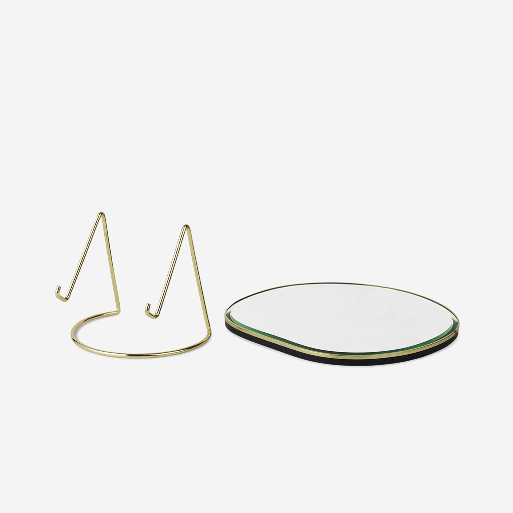 Set on a slender, detachable metal stand, our shape-shifting Pond mirror is cut in an asymmetrical silhouette for an intriguing take on a classic design. Inspired by free-flowing movements of water, the organically-shaped mirror is made to sit on any surface – from a bedroom dressing table or hallway console to a bathroom shelf – it is an elegant way to reflect your daily routine. Mirror is detachable from stand.