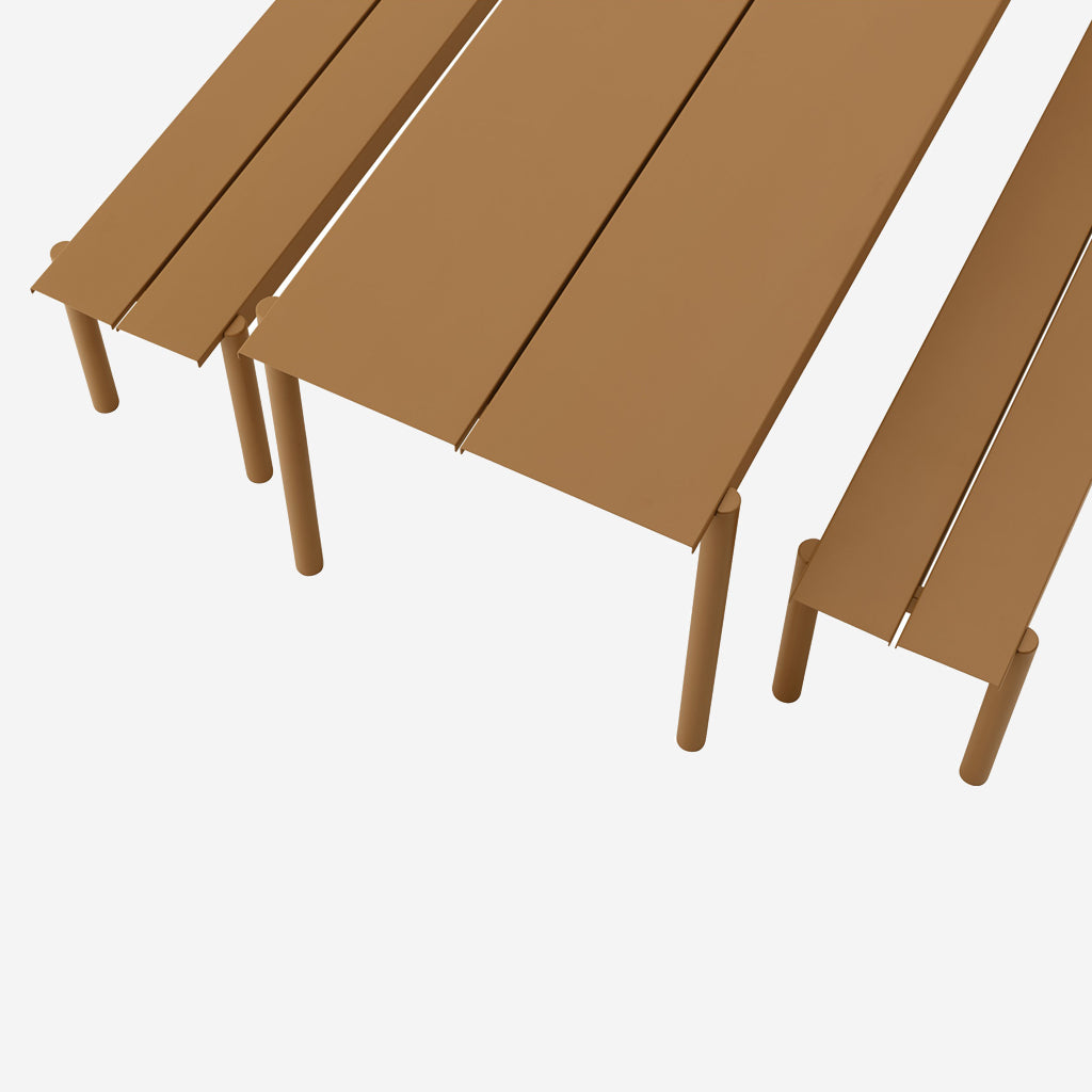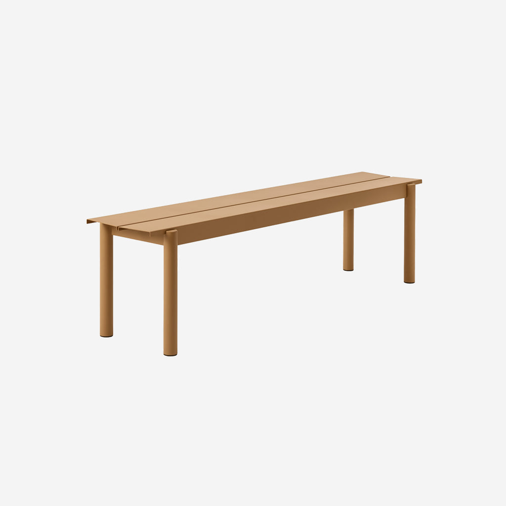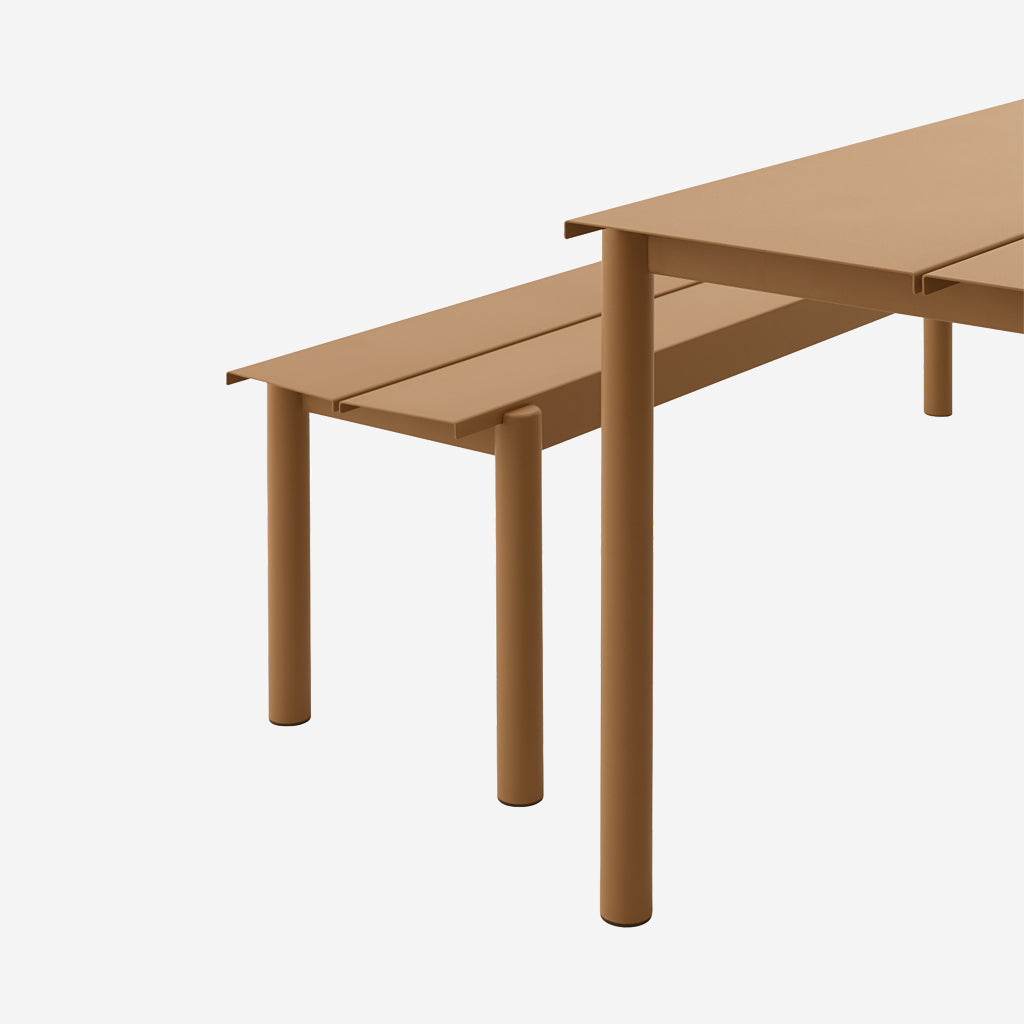 The Linear Steel Bench brings new perspectives to modern outdoor furniture through its straight lines alongside the folded edges, half circular intersecting legs and small spacing for easy removal of water. Kept visually clean for long-lasting aesthetics, the Linear Steel Bench finds it distinct character through subtle detailing and a simple expression, allowing for it to complement any outdoor setting. The Linear Steel Bench is designed in proportions that allows for it to slide easily under the matching Linear Steel Table. Legs come with plastic glides