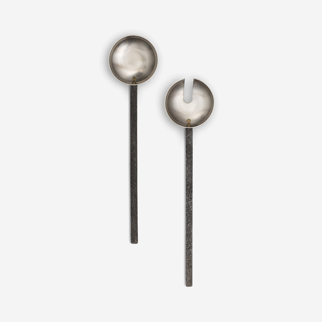 The Obra collection, inspired by the Spanish words for 'deed' and 'action', presents a range of kitchen tools with a clean and industrial aesthetic. Each item is crafted to be a perfect companion in your cooking routines. Characterised by brushed stainless steel and textured black handles that are elegantly connected with brass rivets, these salad servers bring a touch of modern sophistication to any kitchen.