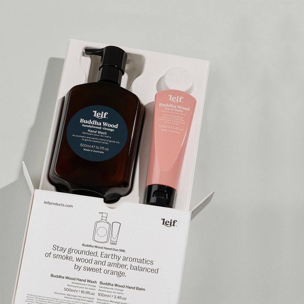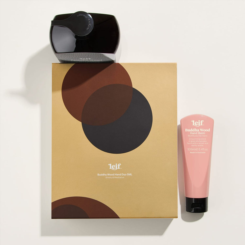 Deeply aromatic Buddha Wood Hand Wash 500mL & Balm 100mL is reimagined with the conceptual artwork of Sydney-based artist Mark Gowing.