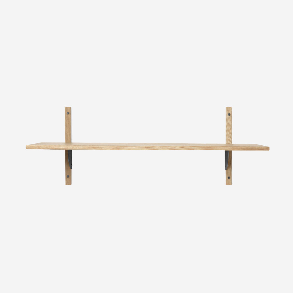 A new and modern take on Mid-century shelving units, Sector is defined by its sturdy simplicity and classic combination of wood and brass – available with natural oak veneer or black stained ash veneer shelves, and polished brass or blackened brass brackets. The shelf attaches to a wall with the accompanying solid wood uprights with visible screws. Use it to display favourite objects in a living room or storage jars in a kitchen.