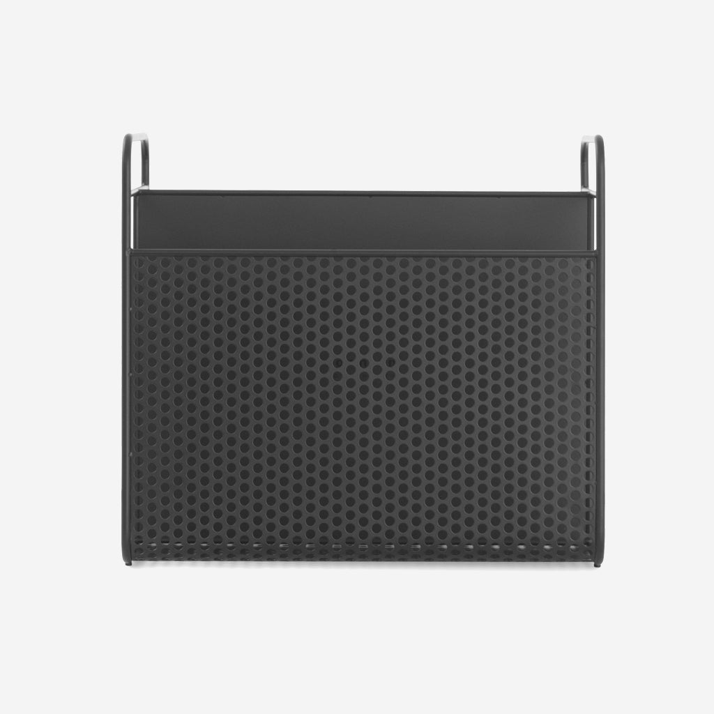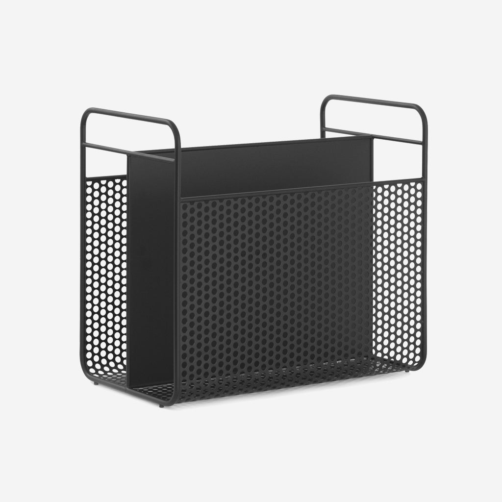 Simplicity and minimalism are the keys to this black Analog magazine rack bby Normann Copenhagen. The perforated appearance adds a beautiful texture to any environment. The shape of the Analog magazine rack is classic. It has two separate areas and practical handles form the basis of the design. The industrial, coated steel gives the rack a modern and masculine expression.