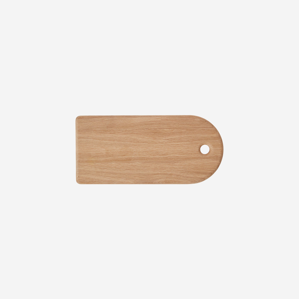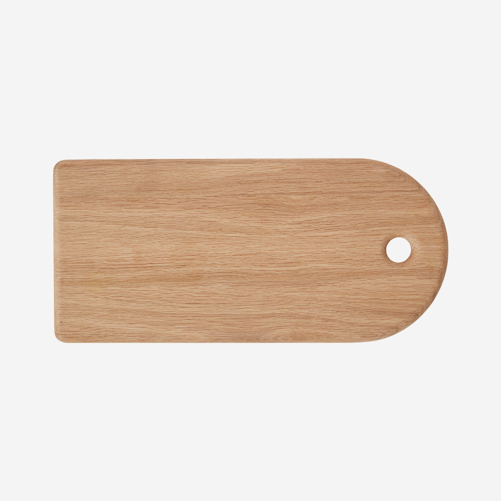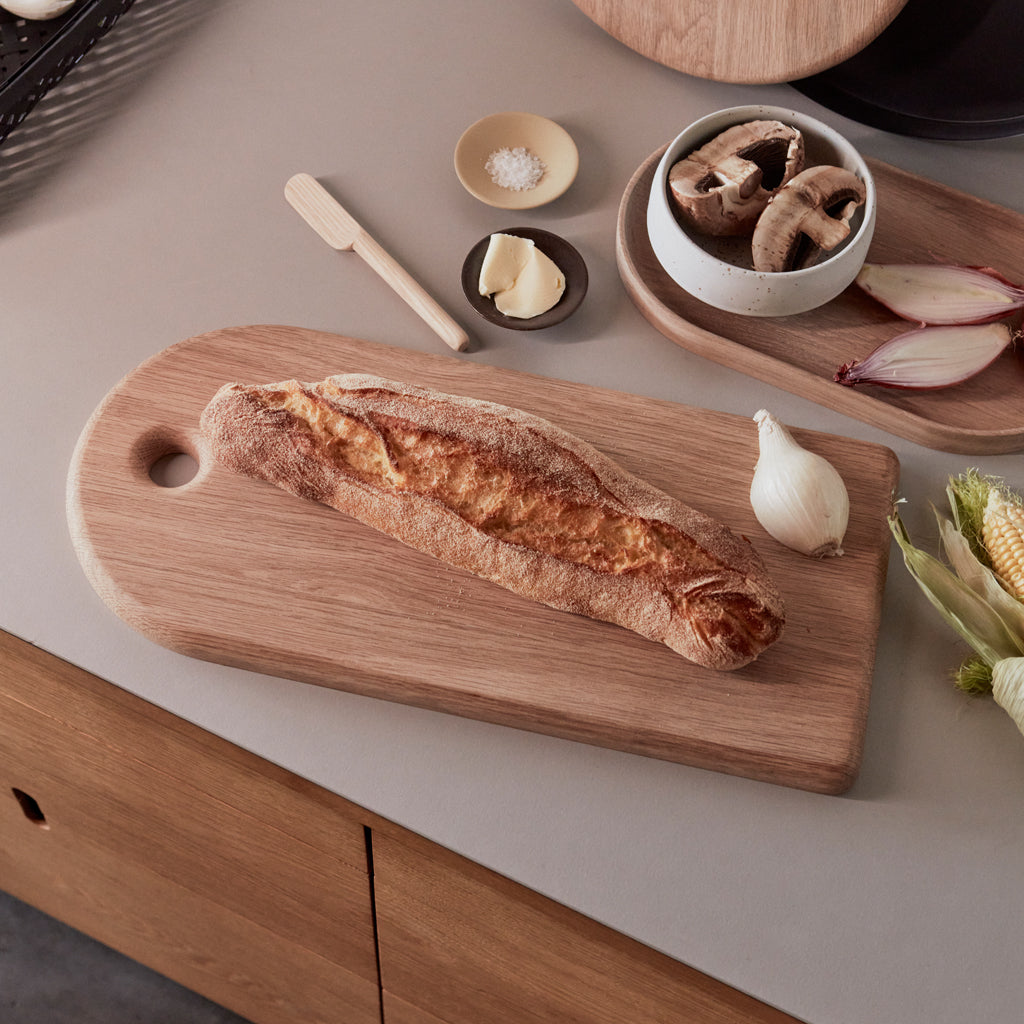 The Yumi Cutting Board has a modern and aesthetic expression with soft and rounded edges. Use the cutting board conveniently or for tapas. The Yumi Cutting Board can stand on the kitchen table or hang on the wall. For a longer lifetime, we recommend treating the cutting board with a food-approved oil continuously as needed.