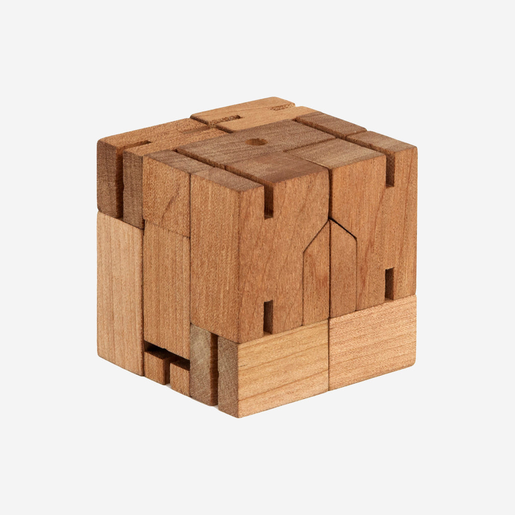 Inspired by Japanese Shinto Kumi-ki puzzles, Cubebot is a non-traditional take on the toy robot. Cubebot's strong medium hardwood frame can hold many poses, and his elastic band muscles and durable wooden limbs make him impervious to breakage. When it's time for him to rest, he folds into a perfect cube. He is a bendable, foldable robot toy that will withstand generations of play.