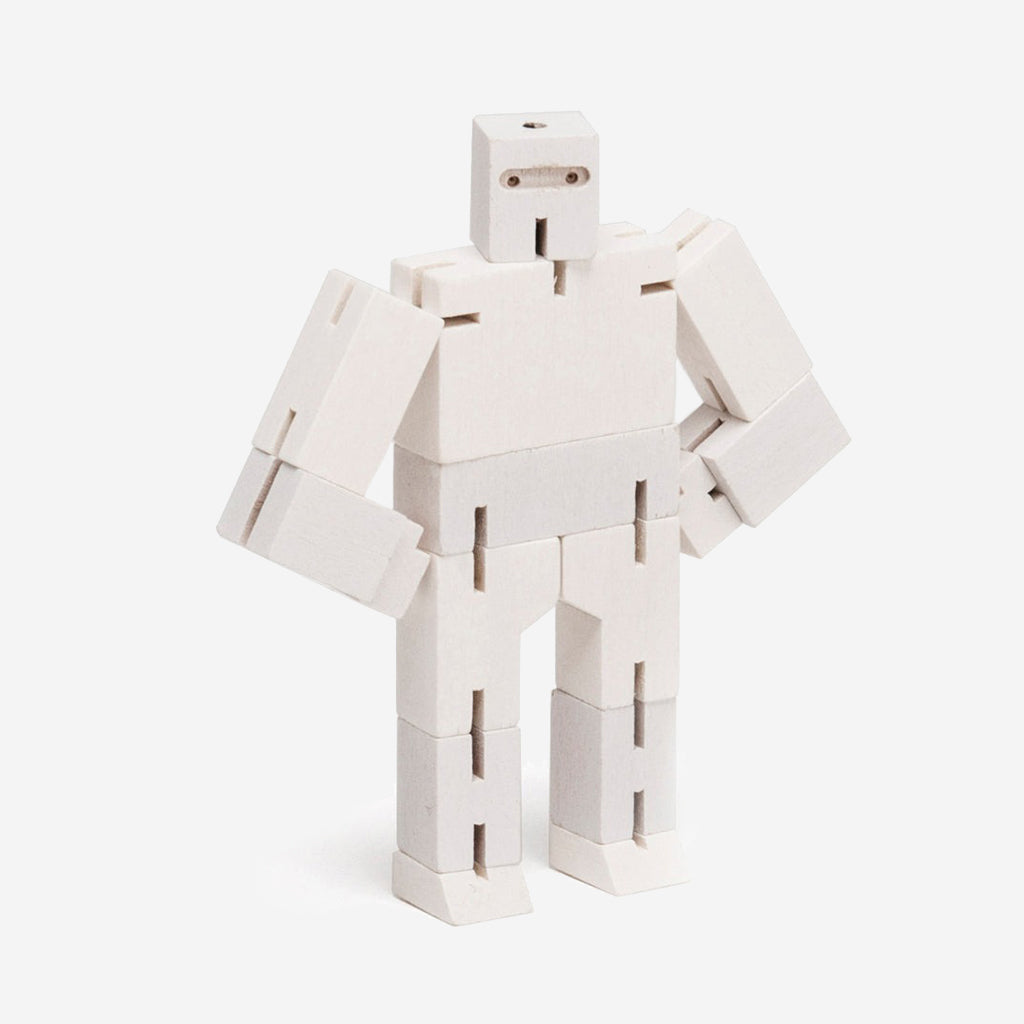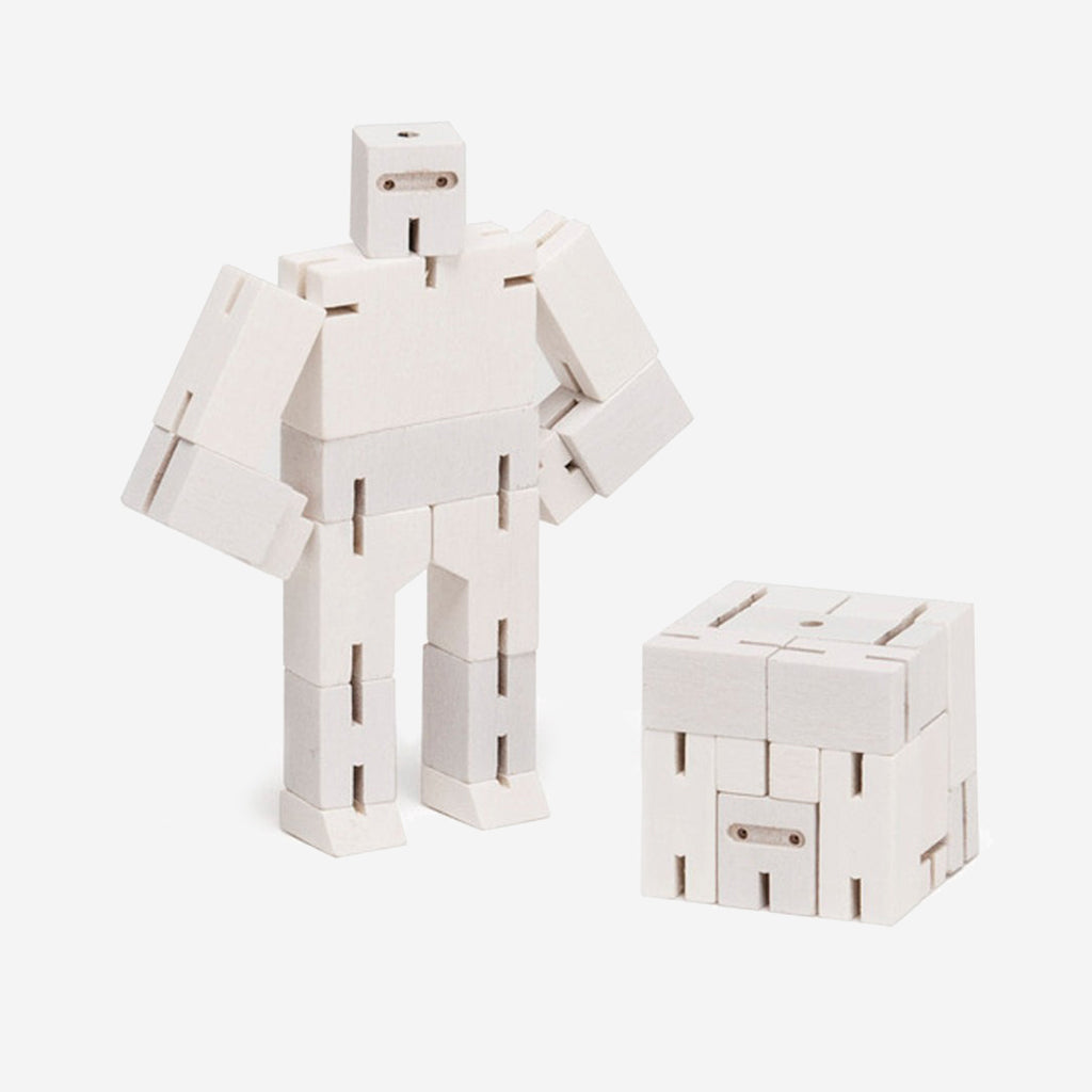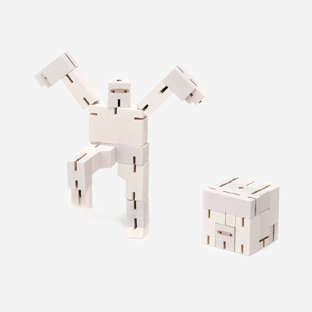 Inspired by Japanese Shinto Kumi-ki puzzles, Cubebot is a non-traditional take on the toy robot. Cubebot's strong hardwood frame can hold many poses, and his elastic band muscles and durable wooden limbs make him impervious to breakage. When it's time for him to rest, he folds into a perfect cube. He is a bendable, foldable ninja toy that will withstand generations of play.