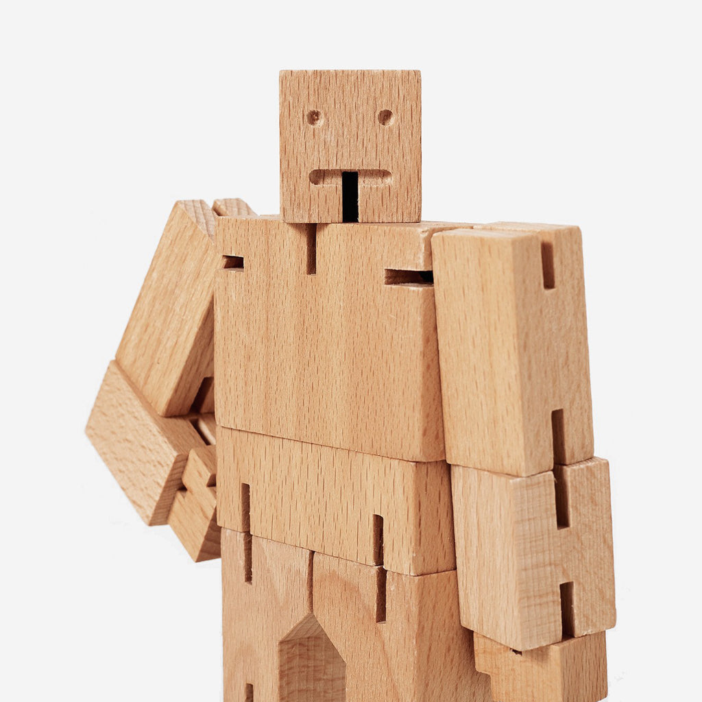 Inspired by Japanese Shinto Kumi-ki puzzles, Cubebot is a non-traditional take on the toy robot. Cubebot's strong hardwood frame can hold many poses, and his elastic band muscles and durable wooden limbs make him impervious to breakage. When it's time for him to rest, he folds into a perfect cube. He is a bendable, foldable robot toy that will withstand generations of play.