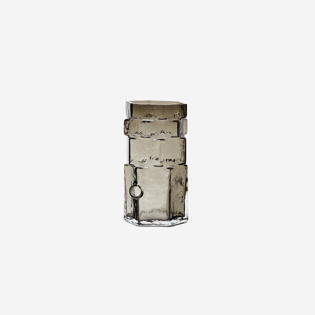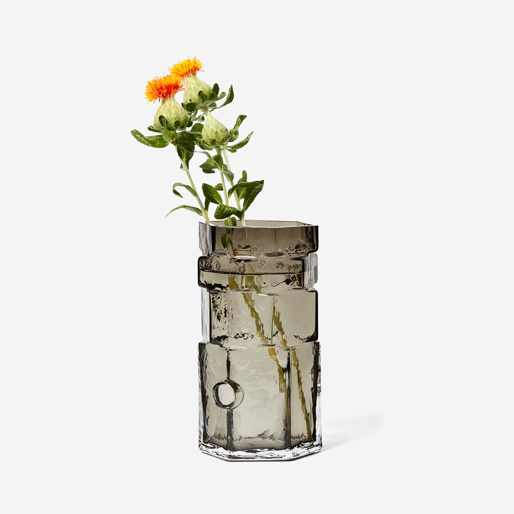 A geometric vase inspired by Brutalist design, featuring stacked hexagonal shapes from Los Angeles-based ceramic design studio, BZIPPY. This piece mirrors notable elements of the designer's signature Hex planter series, adapted for the glass production of this collection of vases. The Hex Vase is the first BZIPPY design in glass, working exclusively without ceramic materials.