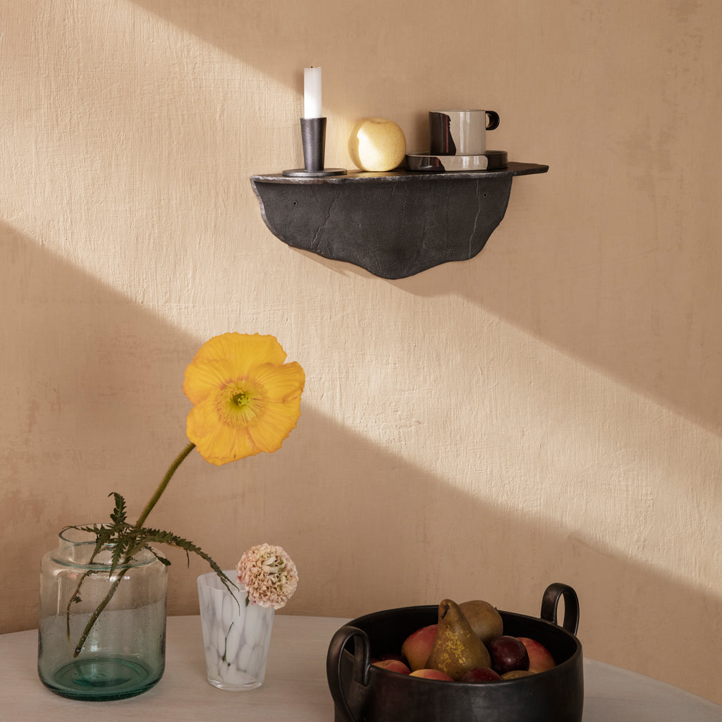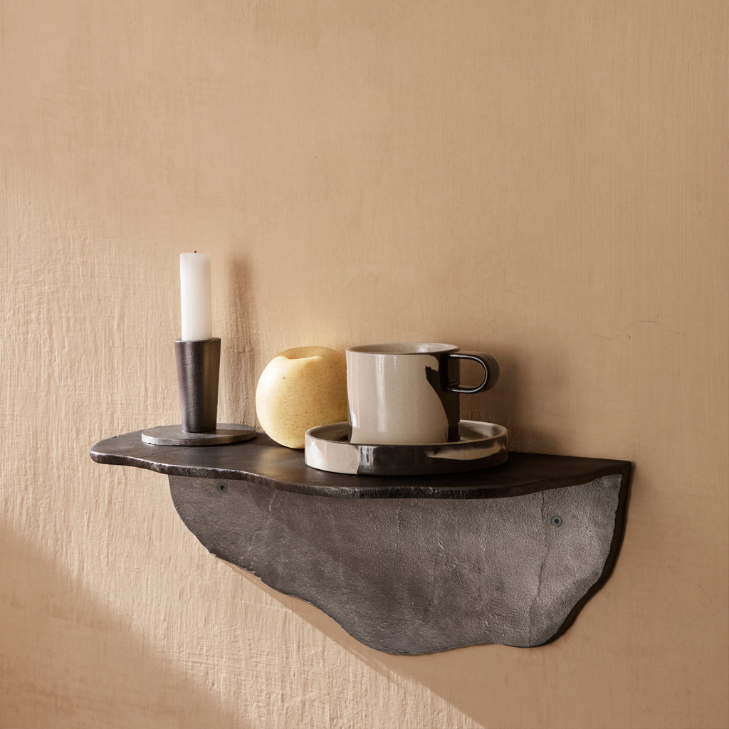 Made from 100% recycled aluminum, this casted, decorative and functional shelf embraces the rough and jagged look of the material, with the casted metal finish mirroring the appearance and texture of fractured natural stone. The Fracture Shelf can be hung in two directions, so that you can decide on its final expression.