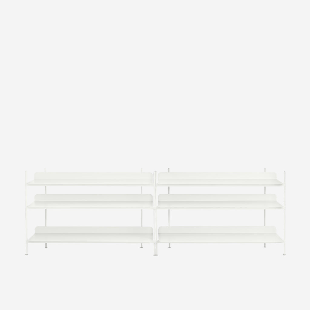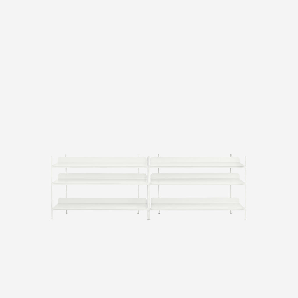 With its simple and refined expression, the Compile Shelving System features clean lines in a solid construction. The lower wall on the back of each shelf gives the Compile Shelving System an understated sense of detailing along with added functionality. Create your own personal Compile Shelving System from its simple components or choose one of the eight pre-arranged solutions.