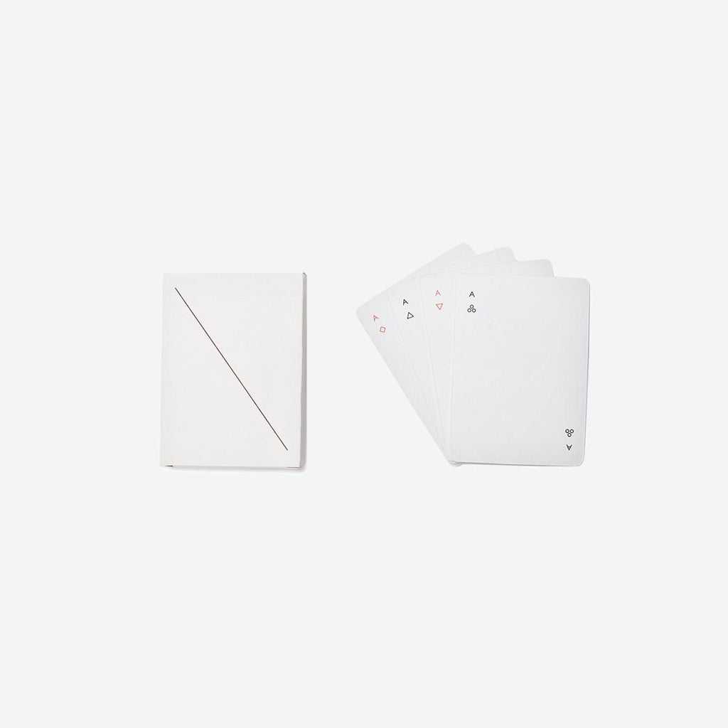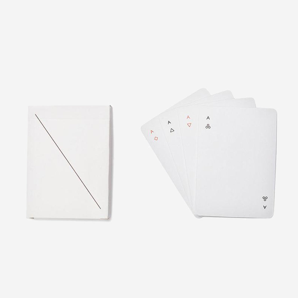 Simple geometric symbols are reductive versions of hearts, clubs, diamonds and spades. While it is necessary to mark the backs of regulation cards, we've done so with minimal diagonal lines instead of the typical ornamental graphics.