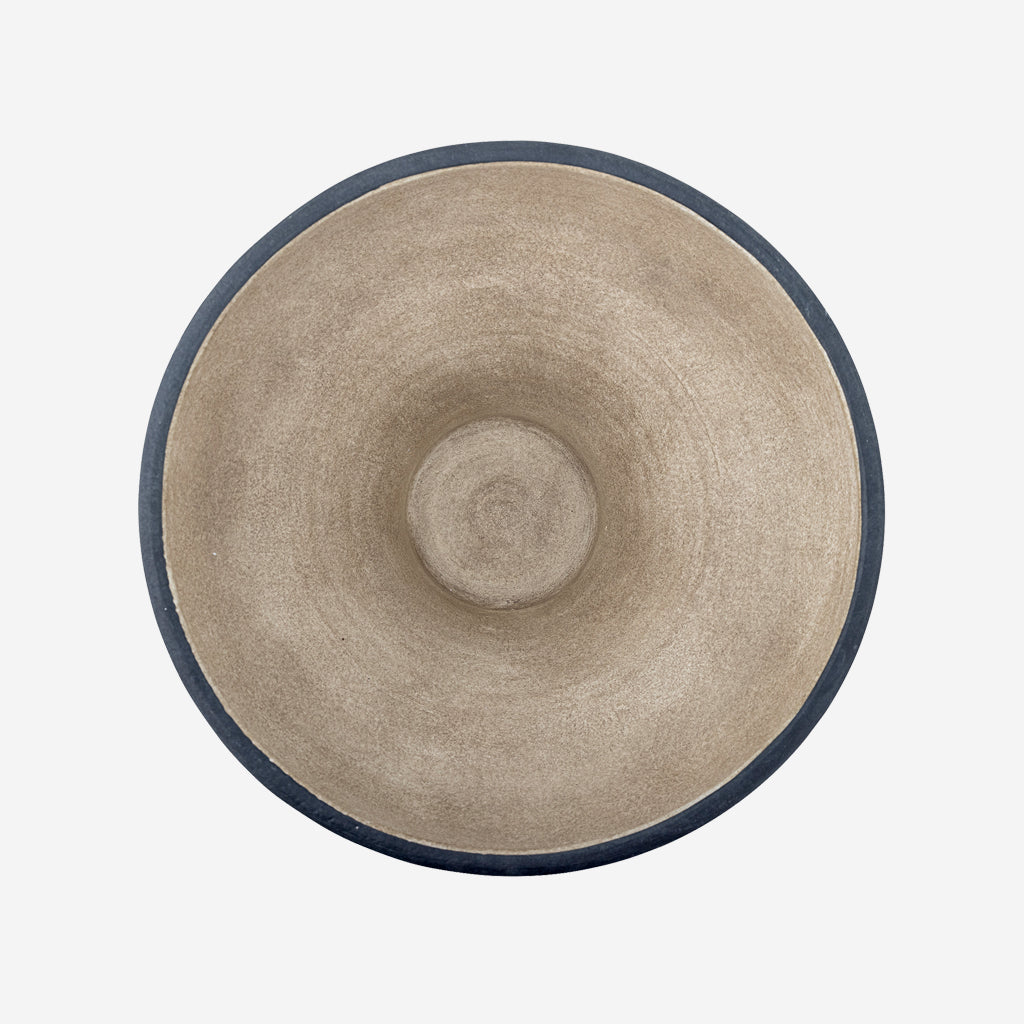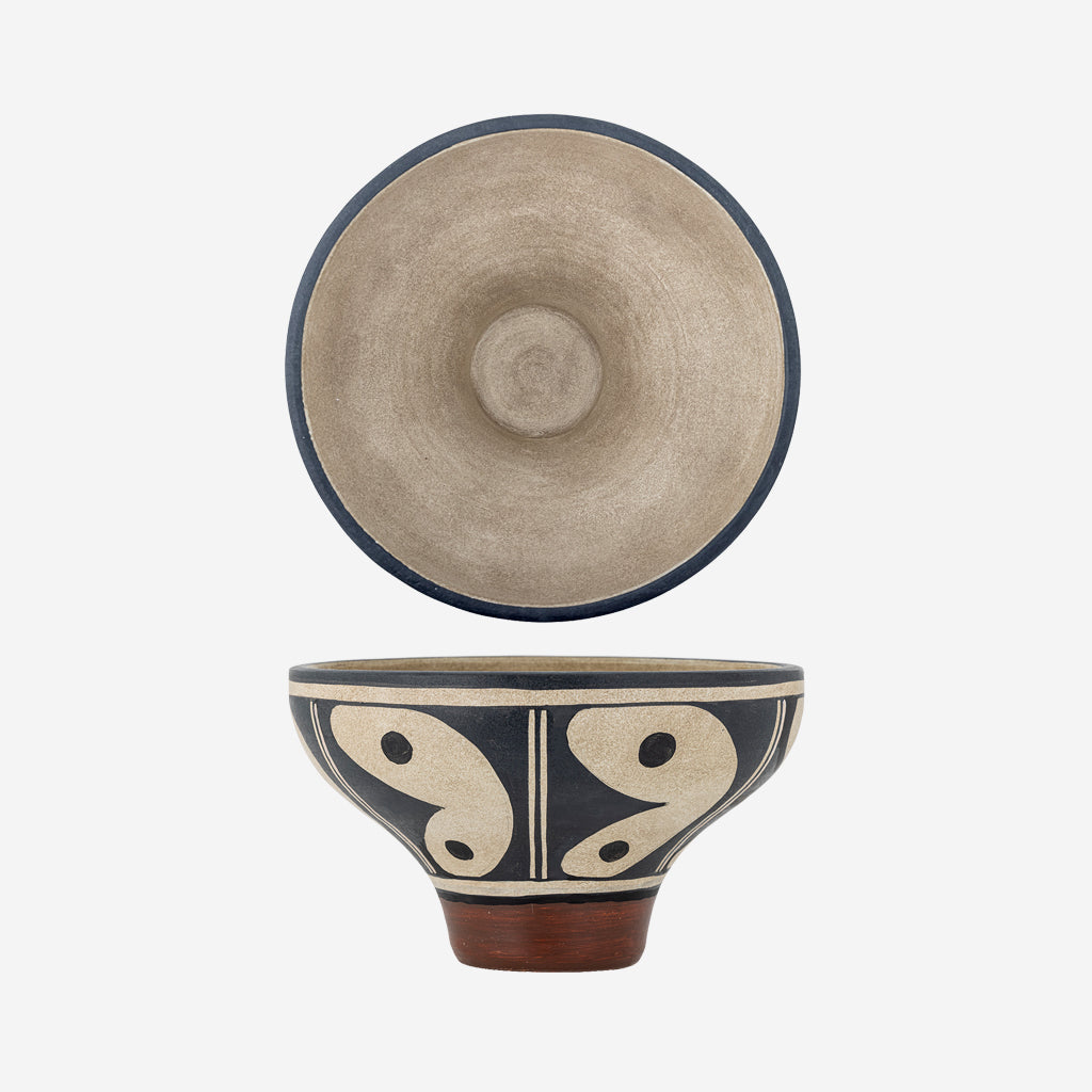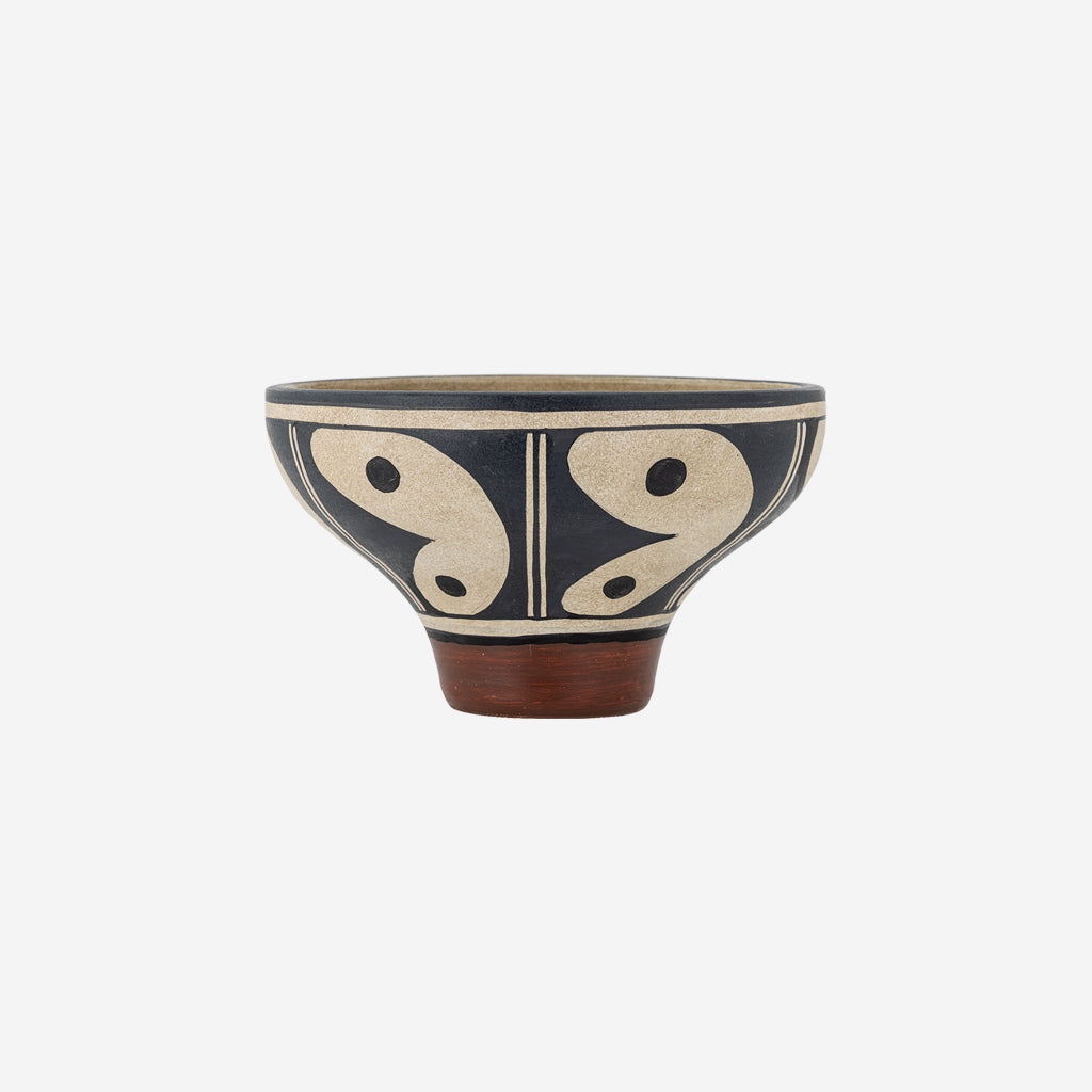 The Elfrida Bowl by Bloomingville is made of terracotta with a deep black base and decorative patterns in warm, sandy shades. The raw surface and high base give the Bowl a characterful touch. The nature of the glaze can cause variations in color, ensuring that each Bowl is unique.