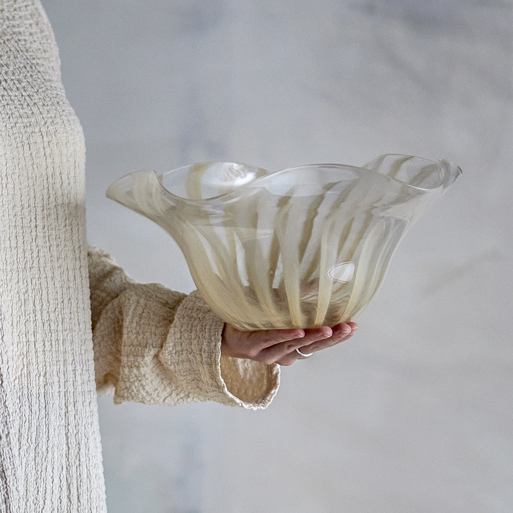 The Imri Bowl by Bloomingville is a beautiful and eye-catching bowl made from striped, colored glass with wavy edges. The elegant shape and soft lines give the bowl a decorative look. It adds a touch of elegance and will be a unique focal point on any table or shelf.