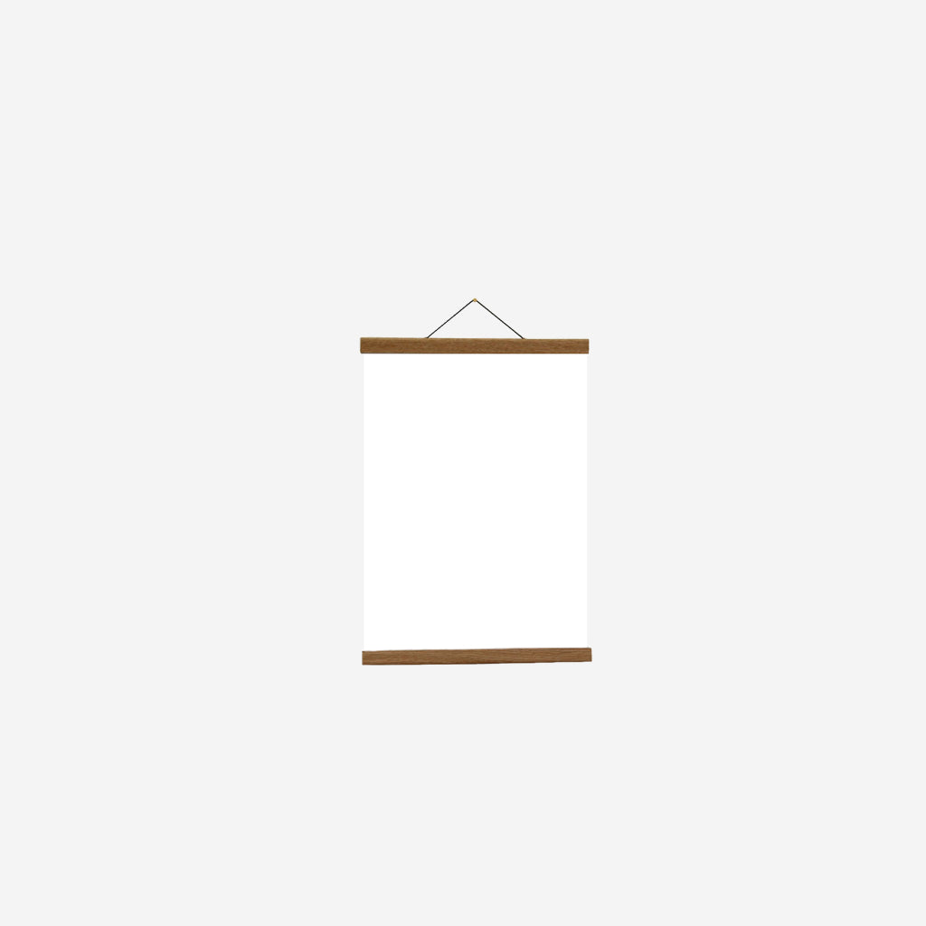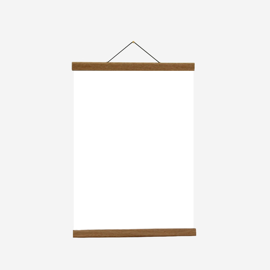 Oak poster hanging bars with strong magnetic grips, designed to work with any poster, print or photograph and even fabrics. Supplied ready to hang with a fixed cord, brass headed picture pin included. Requiring no adhesive tape or pins, this hanger set is infinitely reusable and quick to change.