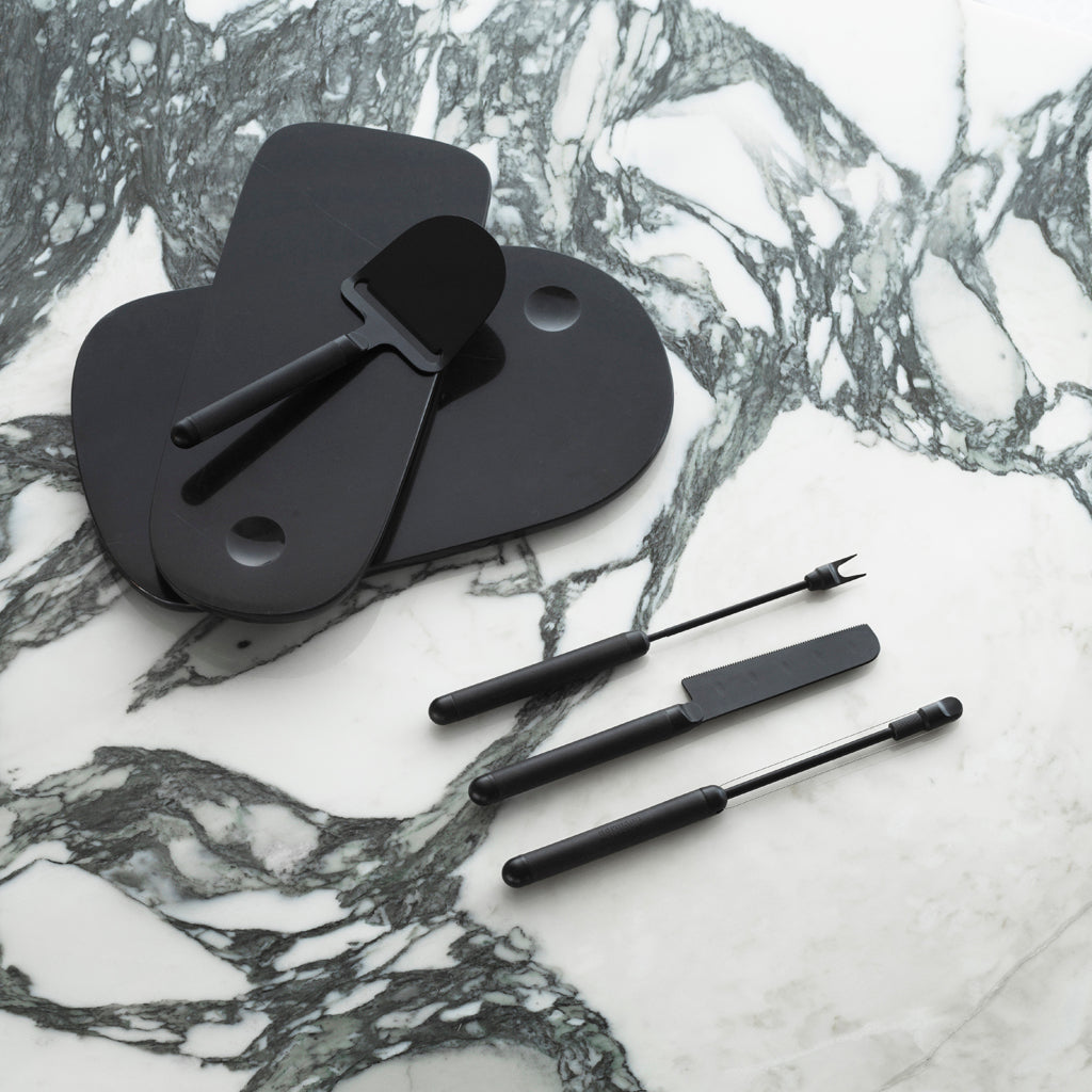 Pebble is a collection for serving cheese, designed with an eye for elegant visual presentation. The collection consists of four different utensils and a serving board in two sizes. With Pebble, designer Simon Legald has taken everyday utensils and given them an aesthetic boost. The cutting utensils have a minimalistic, moulded expression, which still clearly conveys their function. With a knife for soft cheeses, a plane for hard cheeses and a slicer for medium cheeses, as well as a cheese fork, you can put together a complete cheese set.