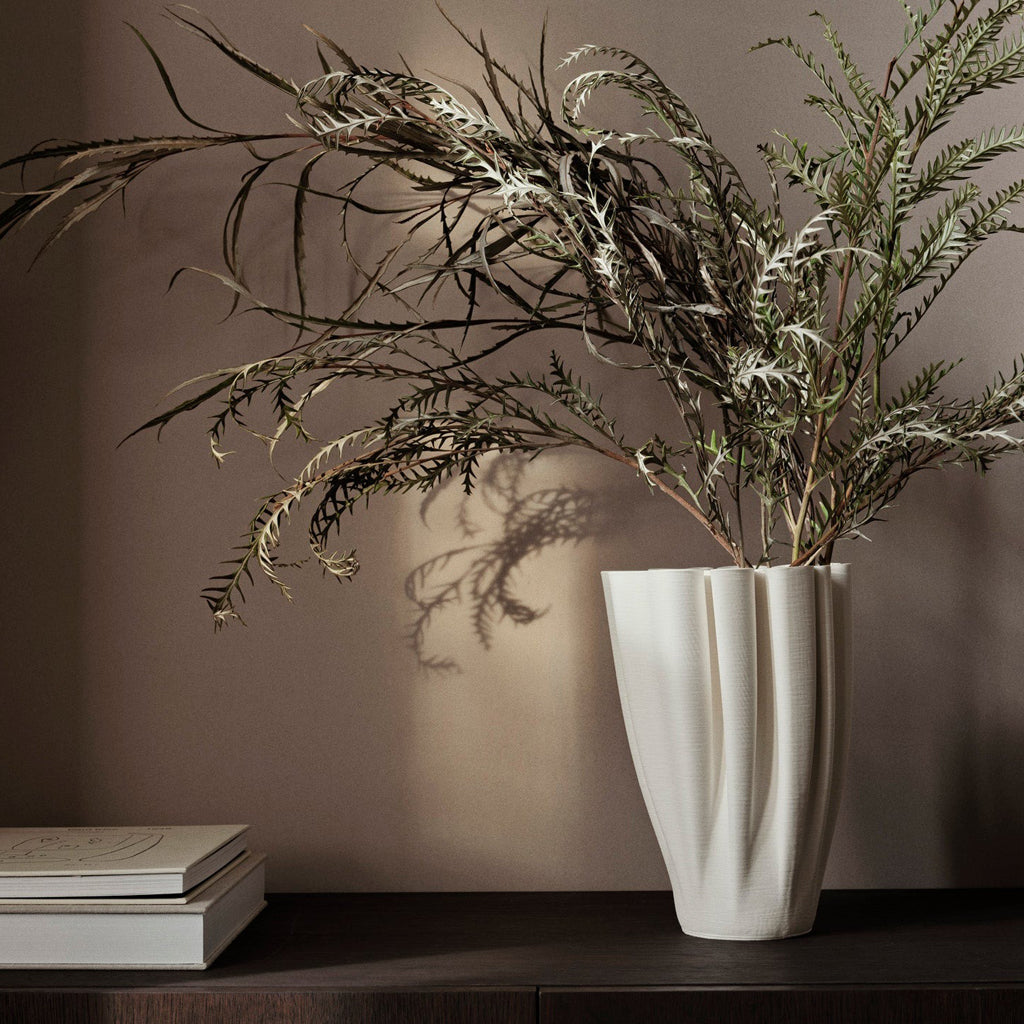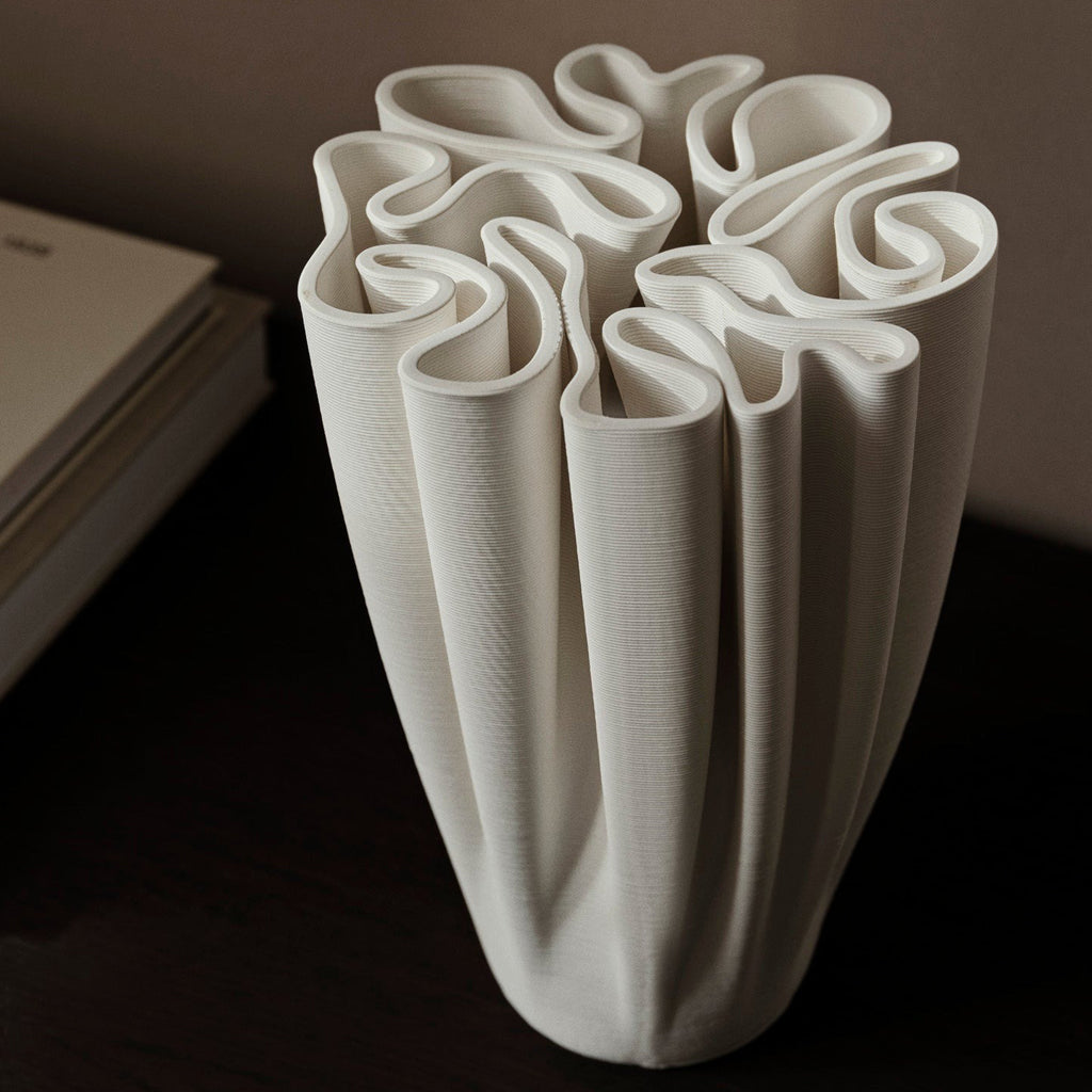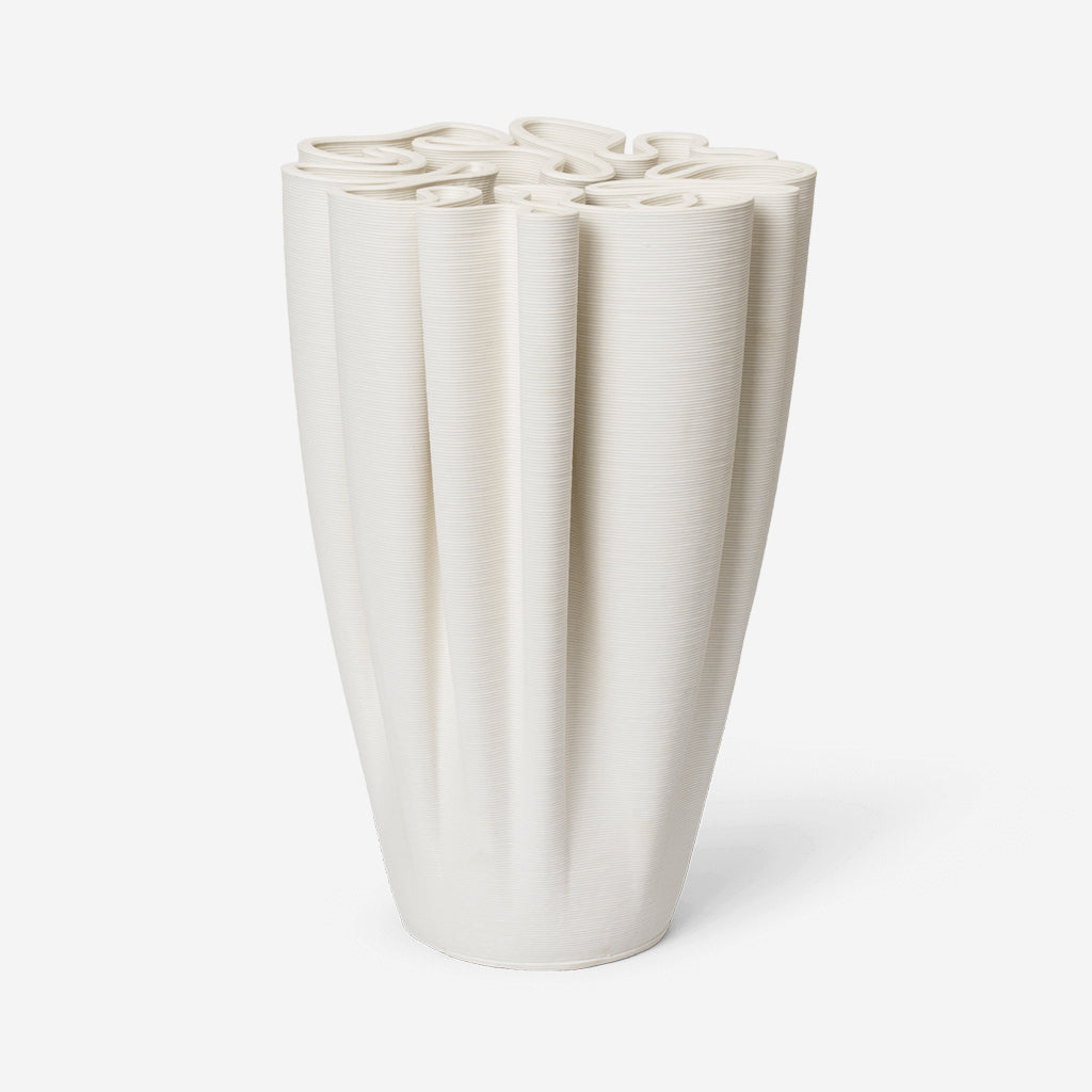 Echoing the elaborate patterns of a 'Dédales' or labyrinth, the Dedali Vase is a fusion of art and utility. Crafted from 3D-printed ceramic, its labyrinth-like top is not only aesthetically pleasing but also functional for arranging flowers in a voluminous, Ikebana-style.