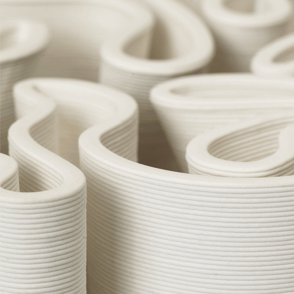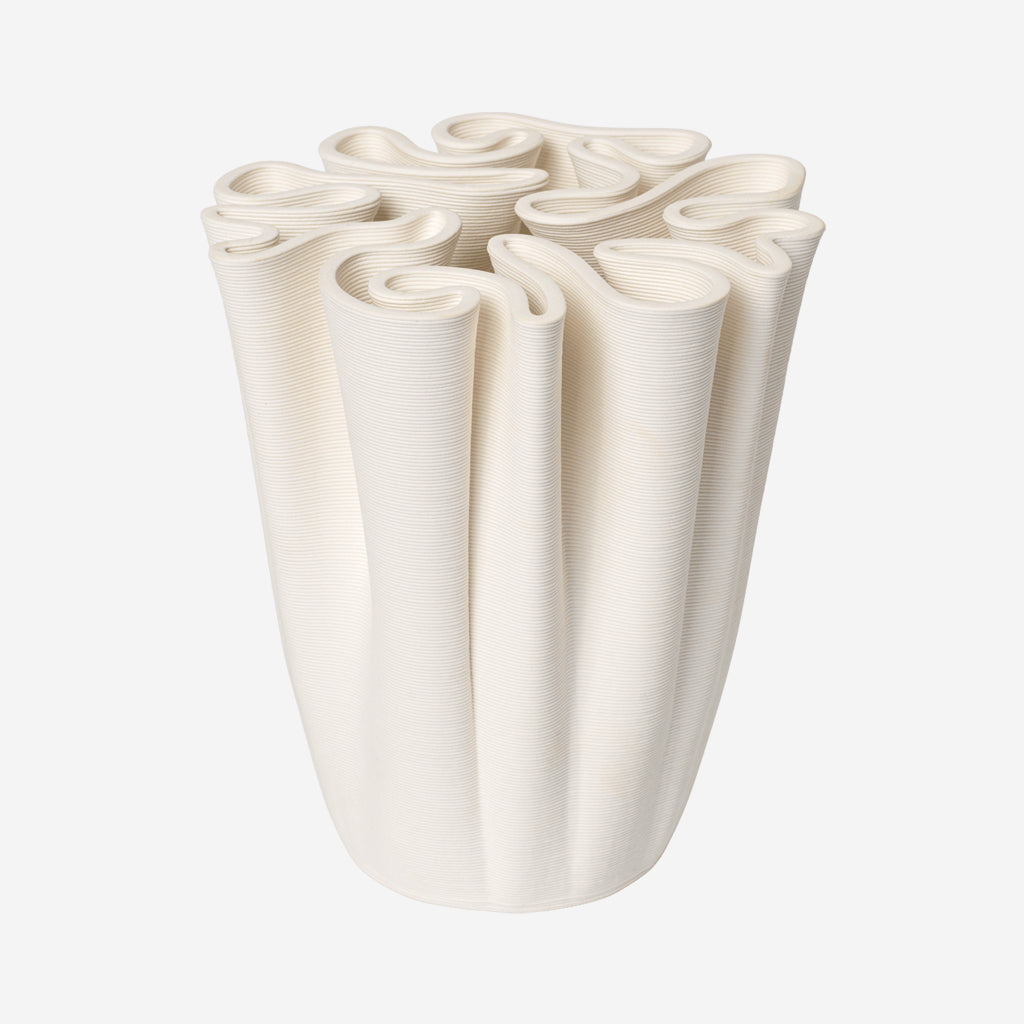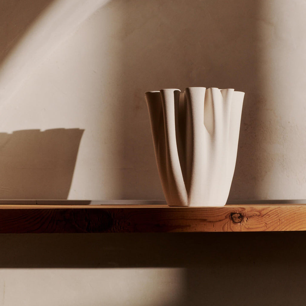 Echoing the elaborate patterns of a 'Dédales' or labyrinth, the Dedali Vase is a fusion of art and utility. Crafted from 3D-printed ceramic, its labyrinth-like top is not only aesthetically pleasing but also functional for arranging flowers in a voluminous, Ikebana-style.