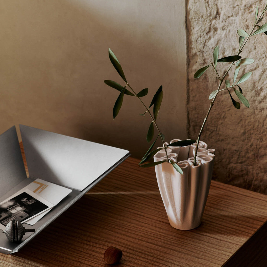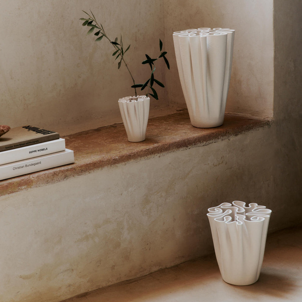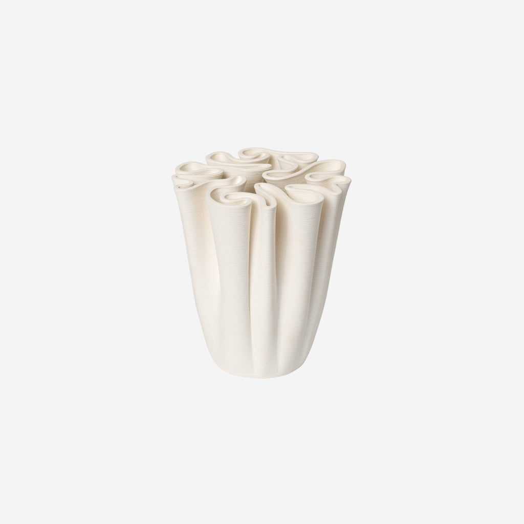 Echoing the elaborate patterns of a 'Dédales' or labyrinth, the Dedali Vase is a fusion of art and utility. Crafted from 3D-printed ceramic, its labyrinth-like top is not only aesthetically pleasing but also functional for arranging flowers in a voluminous, Ikebana-style.