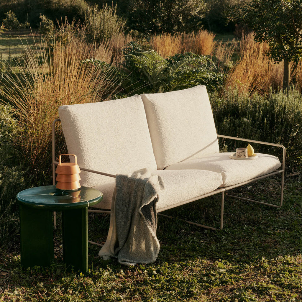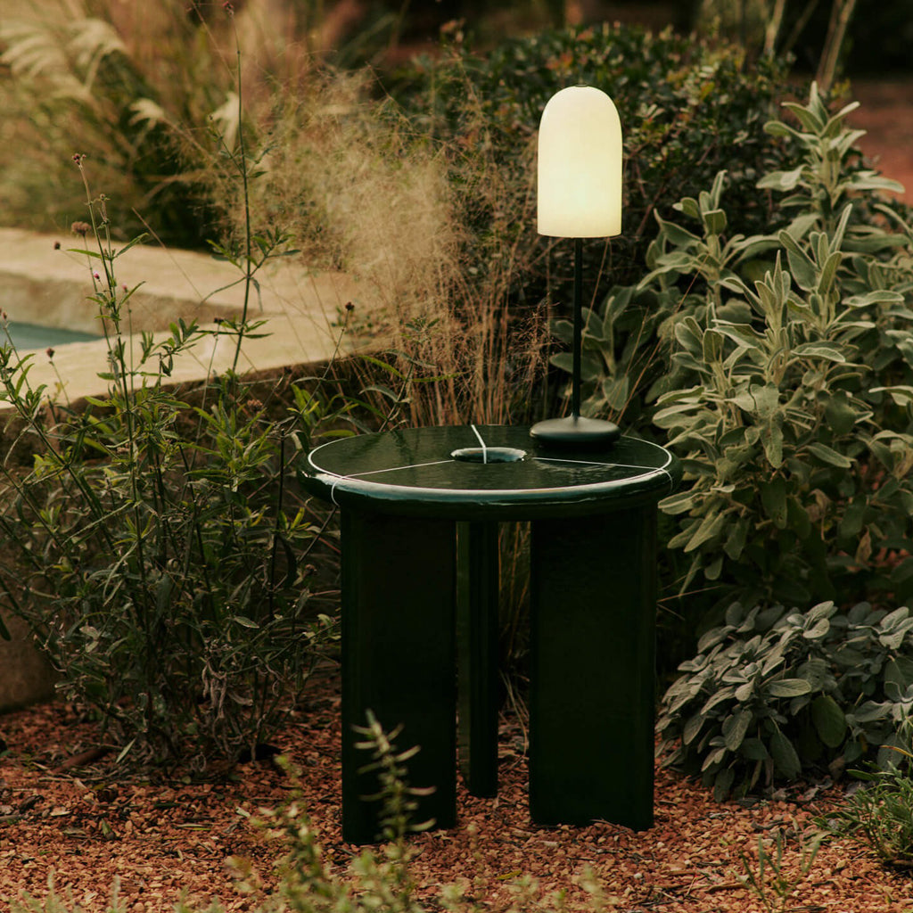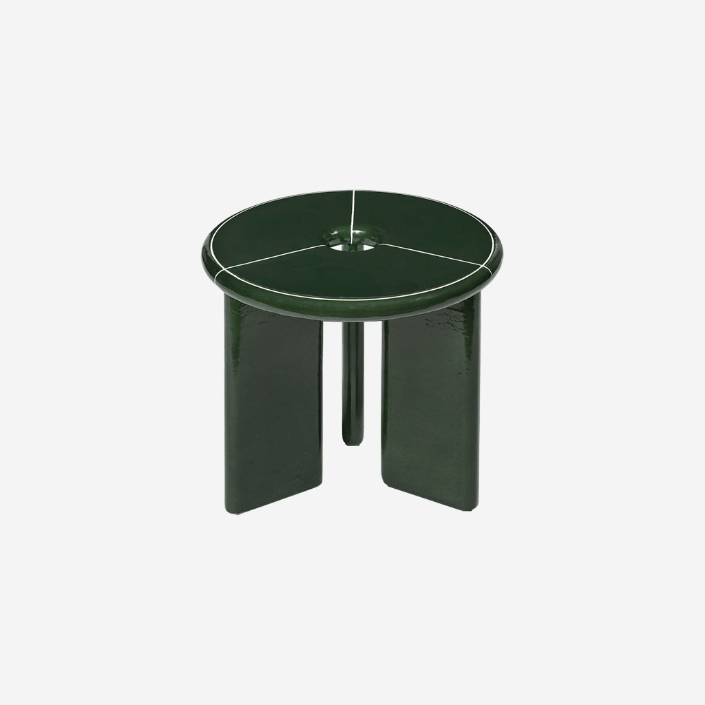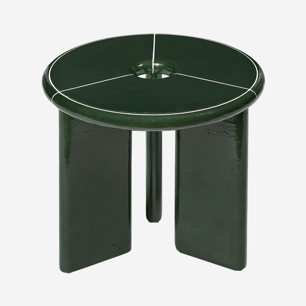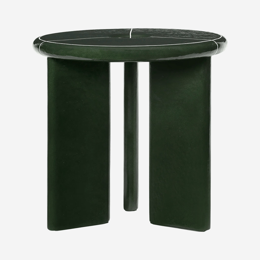 Crafted from fibre concrete, the Deya Side Table features a striking dark green glaze with an uneven texture, accentuated by off-white grout lines. The segmented tabletop introduces a bold geometric appeal, complemented by generously rounded edges for a softened presence. Balancing artisanal craftsmanship with bold geometry, the Deya Side Table is a versatile piece, suitable for both indoor and outdoor spaces.