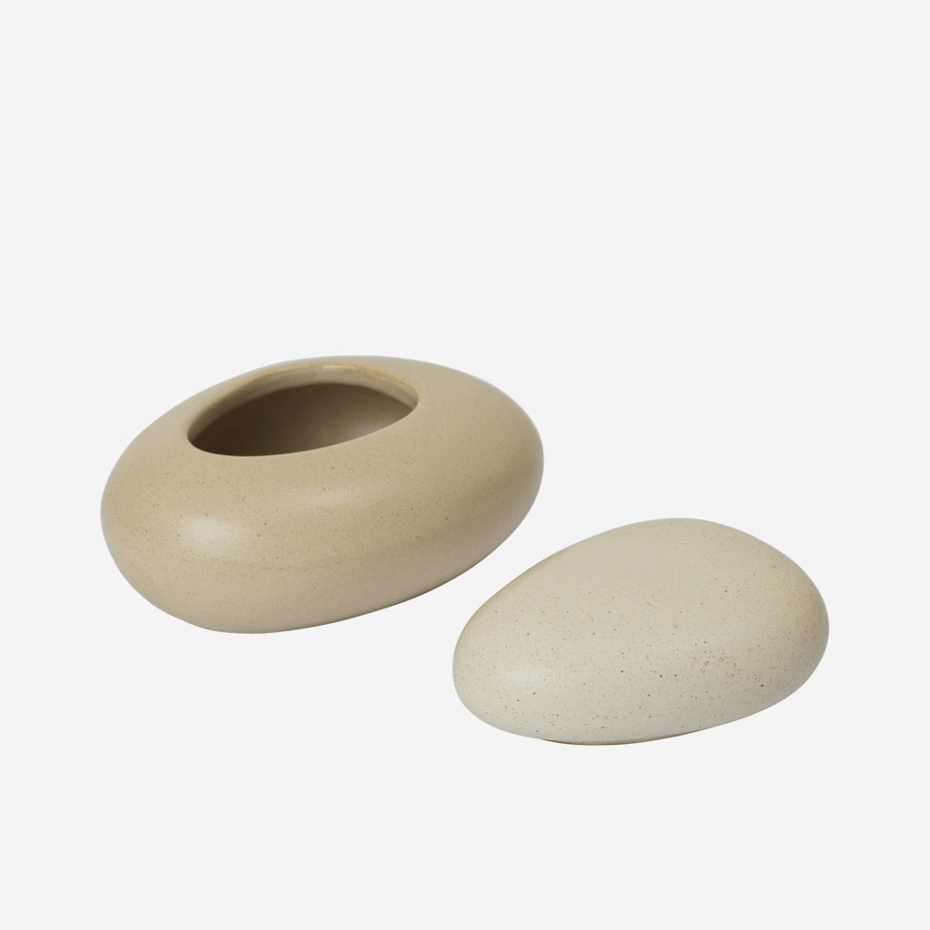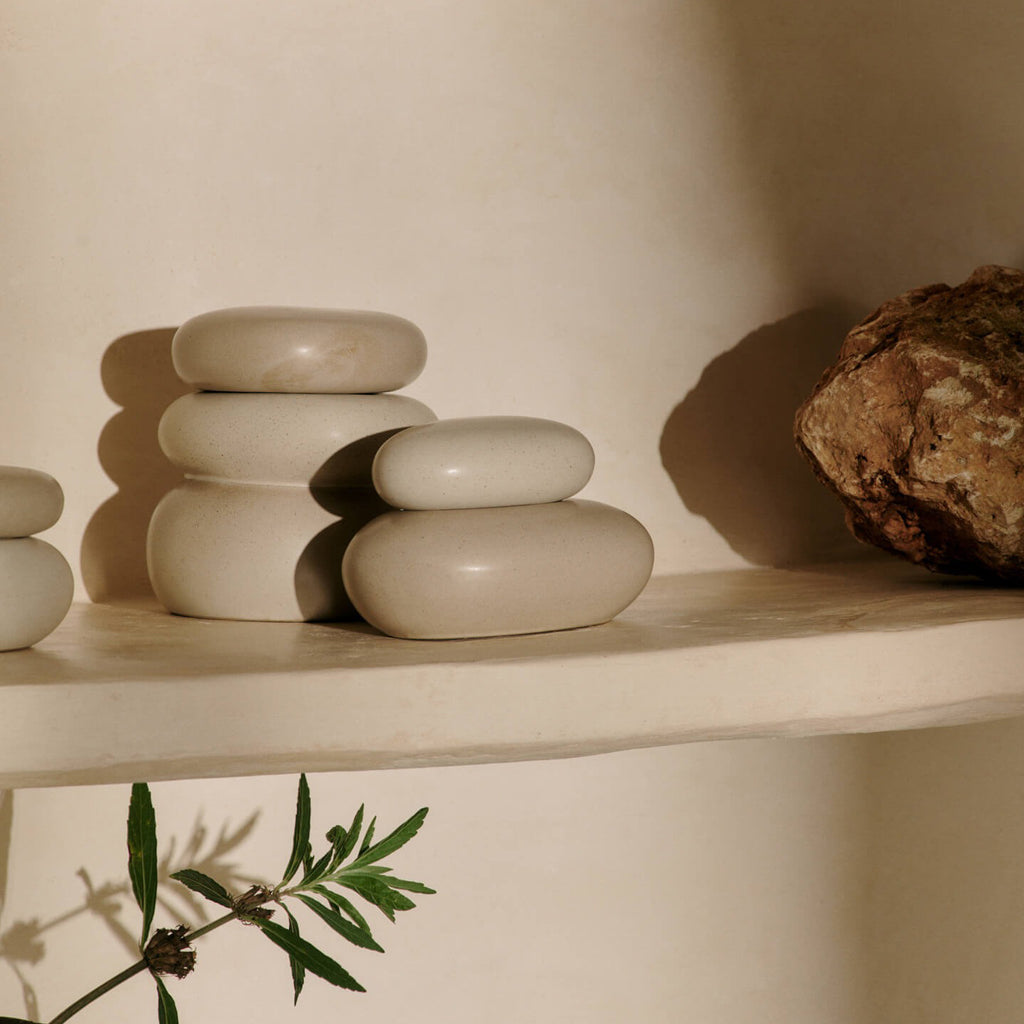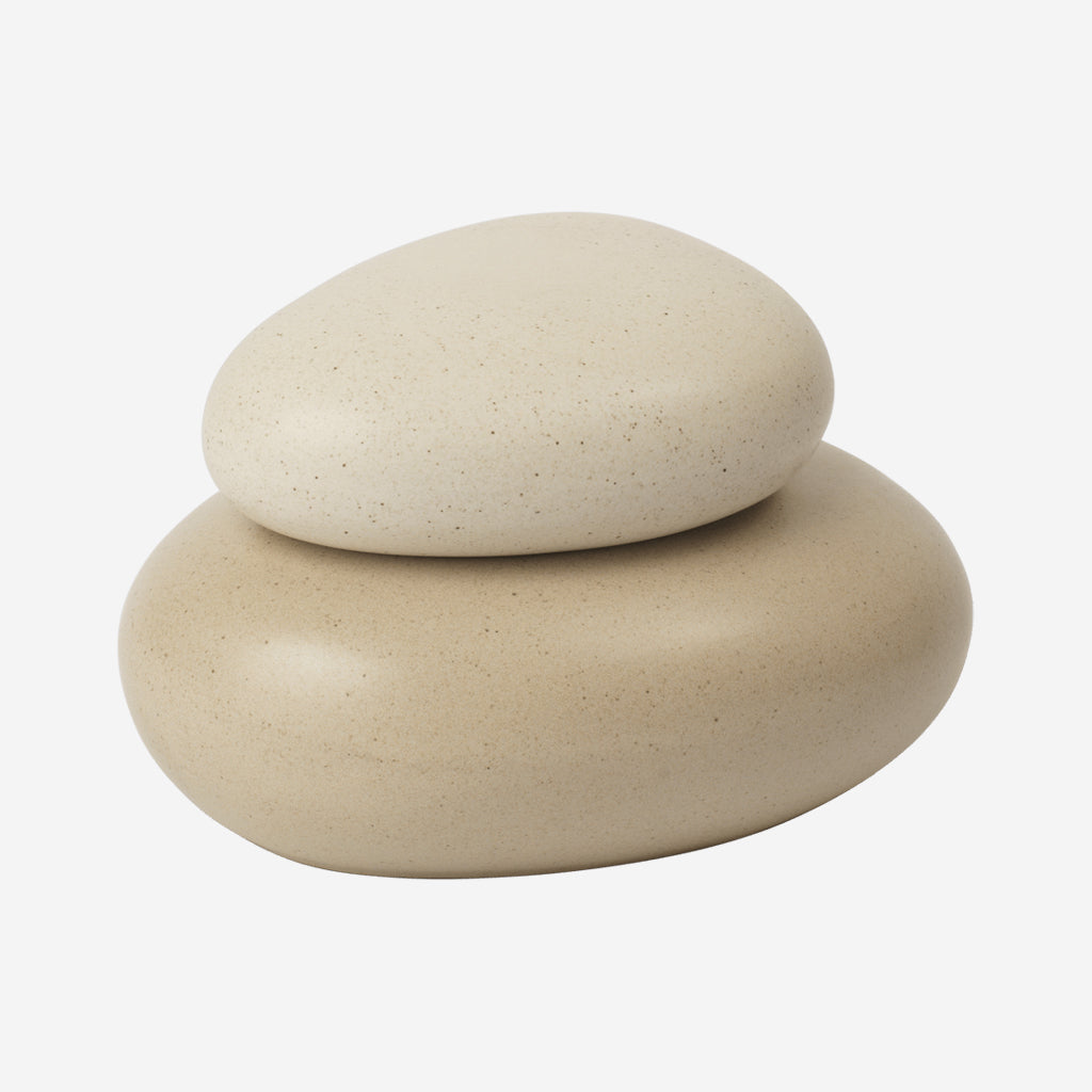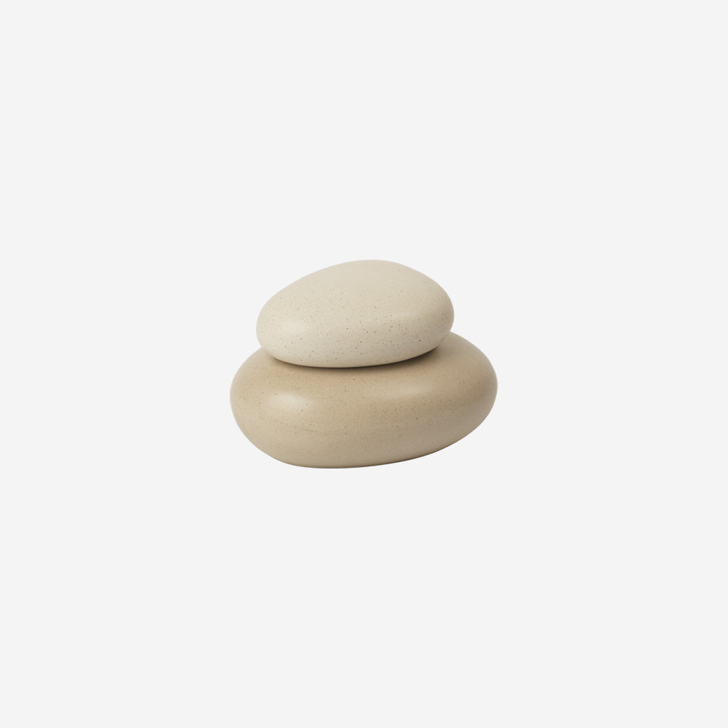 The Pebble Box draws inspiration from the natural beauty of stacked pebble stones along the coast, with each box mimicking the smooth, rounded shapes of pebbles. Crafted from glazed ceramic, it features a sleek, polished finish that highlights the elegance and calming appeal of the design. The Pebble Box is available in different sizes and can be displayed individually or stacked together for a dynamic, layered look.