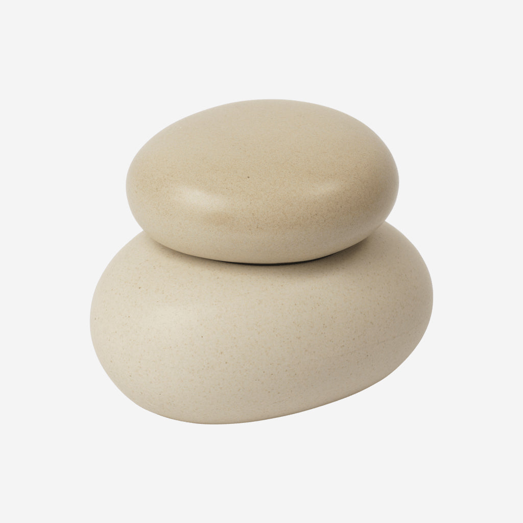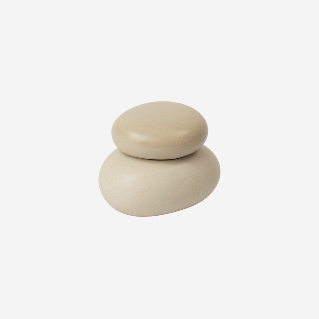The Pebble Box draws inspiration from the natural beauty of stacked pebble stones along the coast, with each box mimicking the smooth, rounded shapes of pebbles. Crafted from glazed ceramic, it features a sleek, polished finish that highlights the elegance and calming appeal of the design. The Pebble Box is available in different sizes and can be displayed individually or stacked together for a dynamic, layered look.