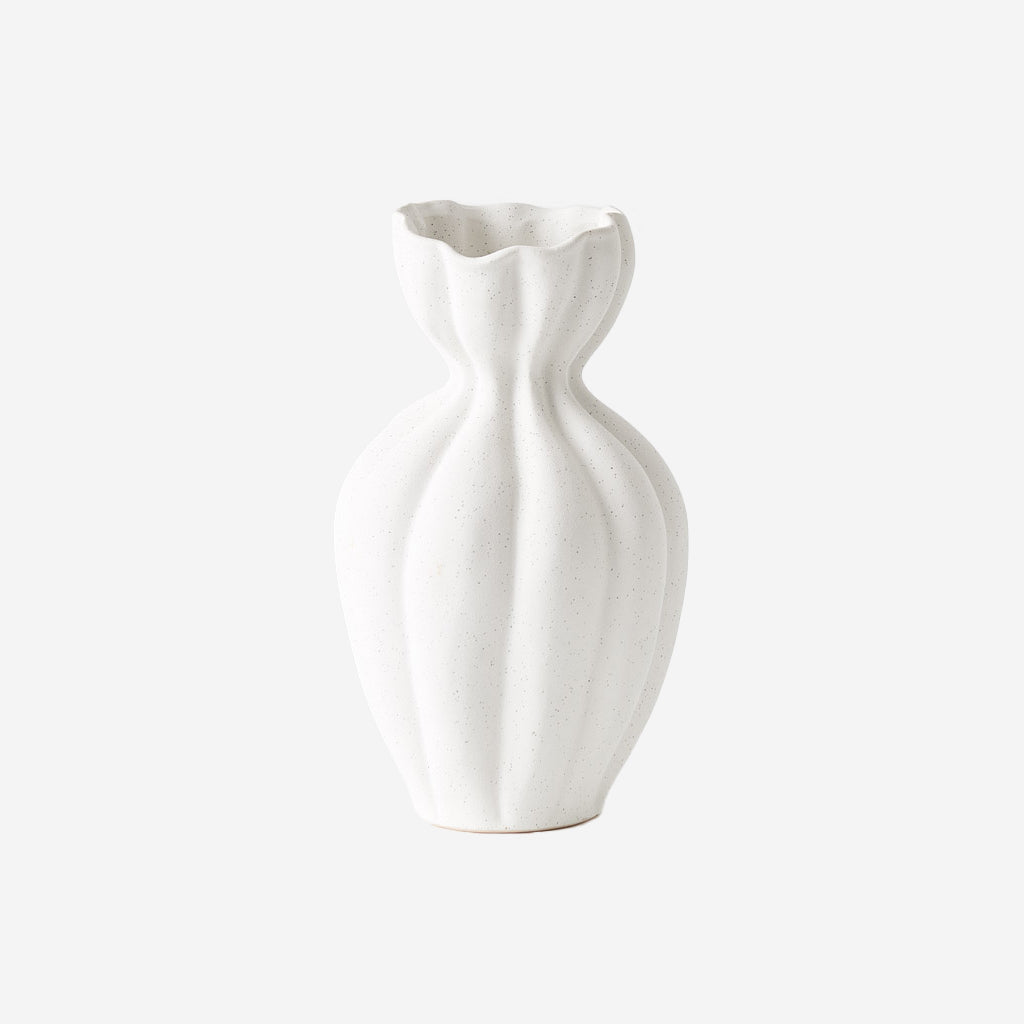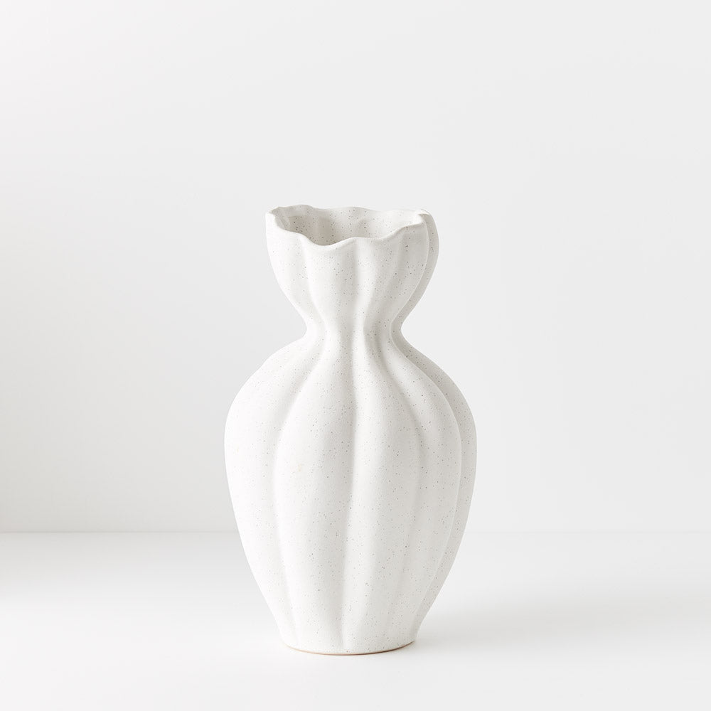 The Basma vase in white has a tiny speckle through its smooth surface, almost salt and pepper like. It’s not only eye-catching on its own, but pairs perfectly with floral and native stems to create an eccentric appearance in any home or office. This ceramic vase is handmade and therefore may have slight variations in size, surface texture, glaze consistency and colour tone between each vase. Note: These decorative vases do not come with a guarantee they will hold water.