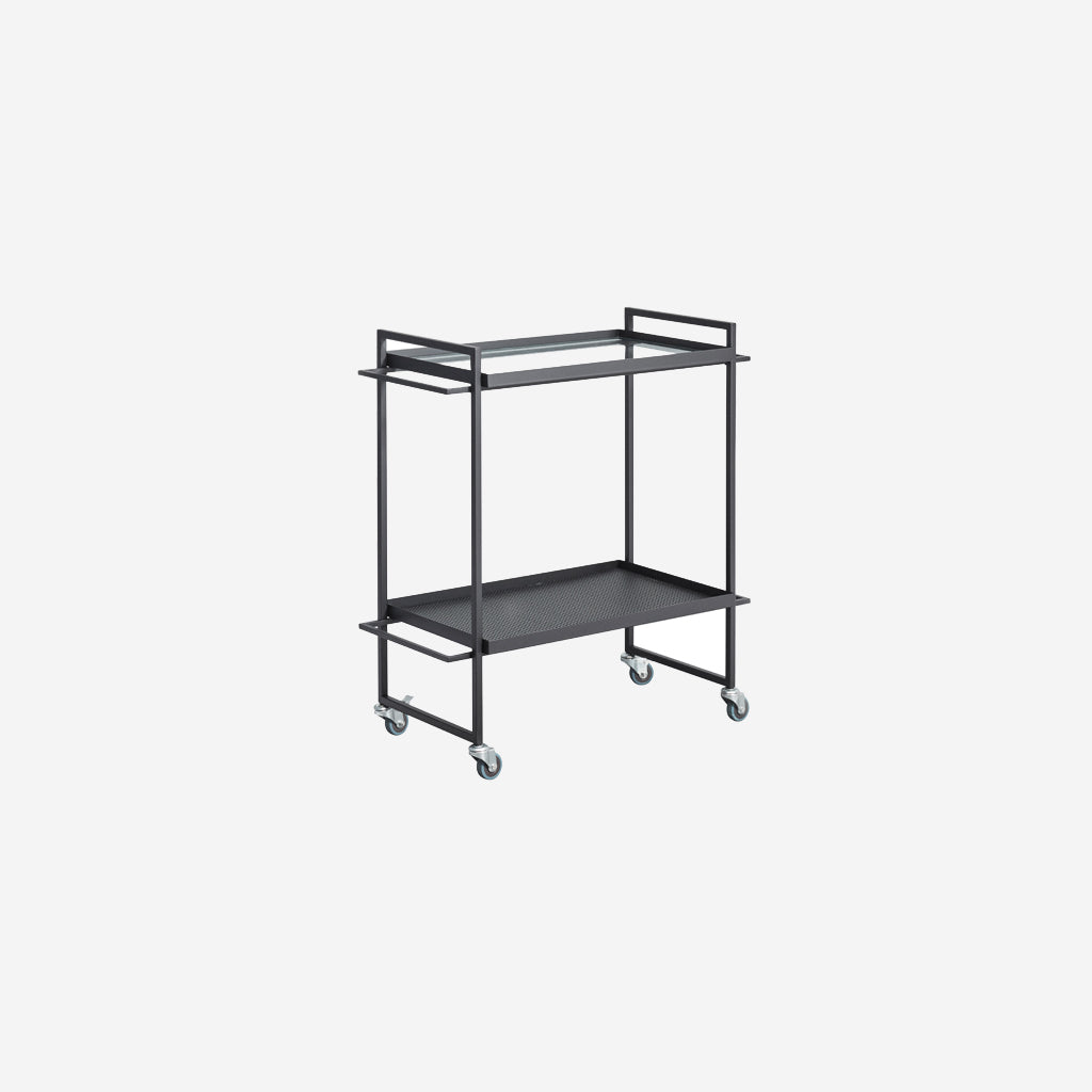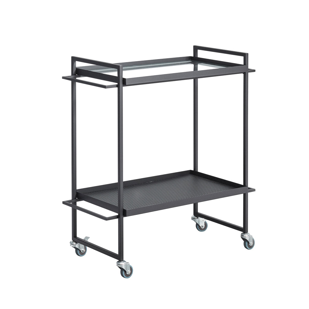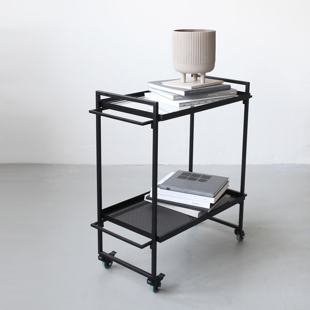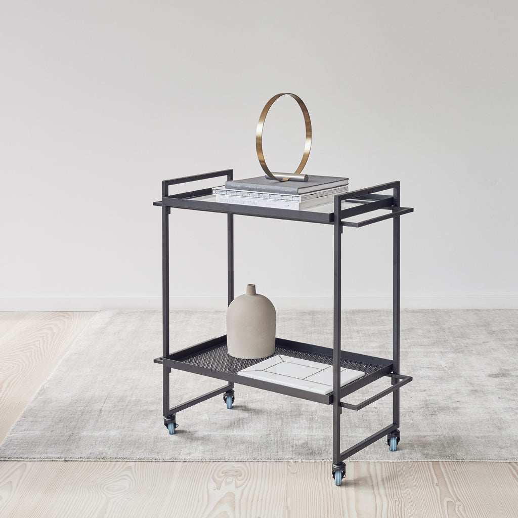 The Bauhaus Trolley is inspired by the influential German art school. Use it as a serving trolley or as a portable table. Made from powder coated steel and includes two trays - one in hardened glass and one made of perforated steel. The wheels of the trolley can be fastened thus making it a stationary small table. This elegant piece of furniture comes flat-packed and is assembled with screws.