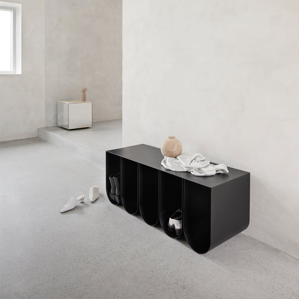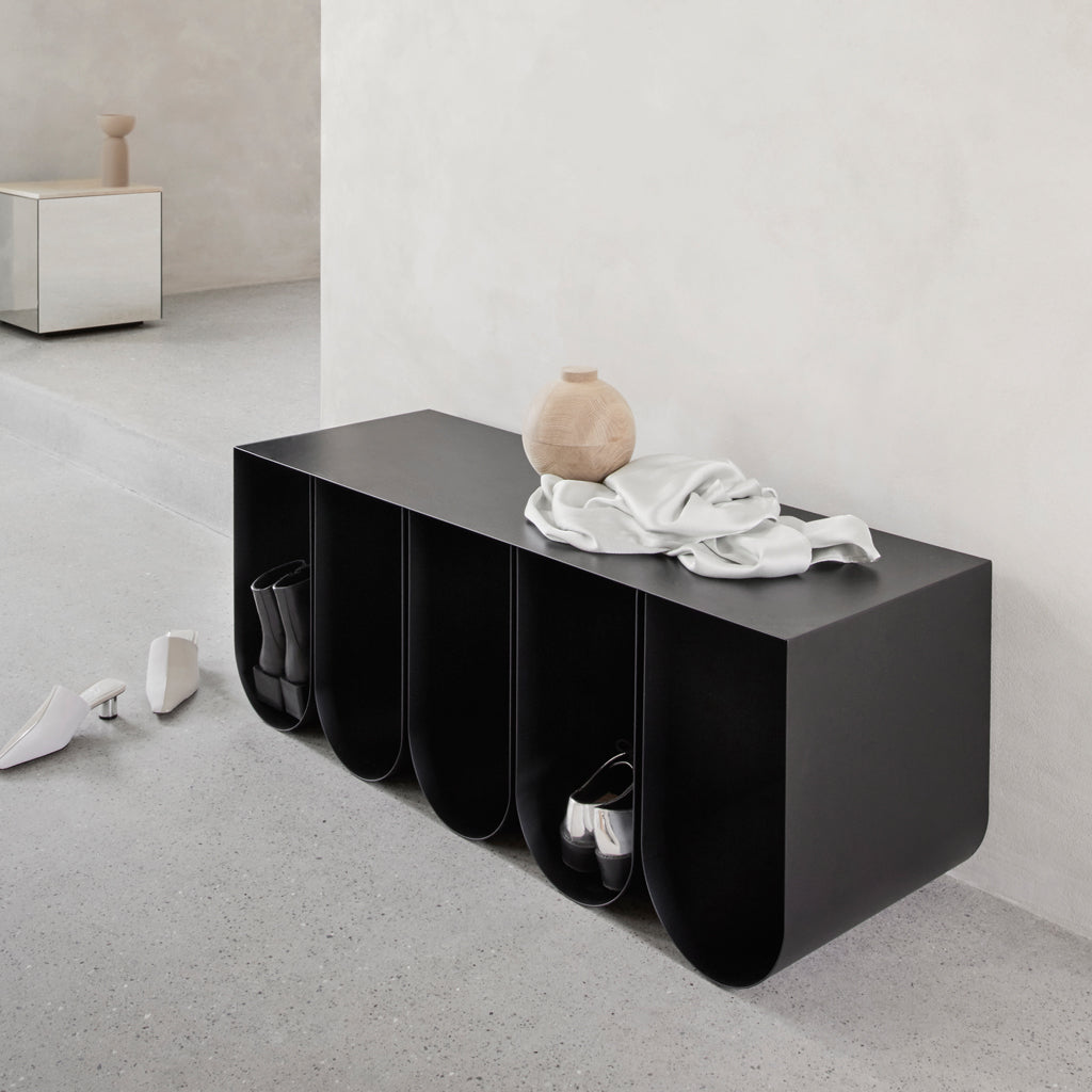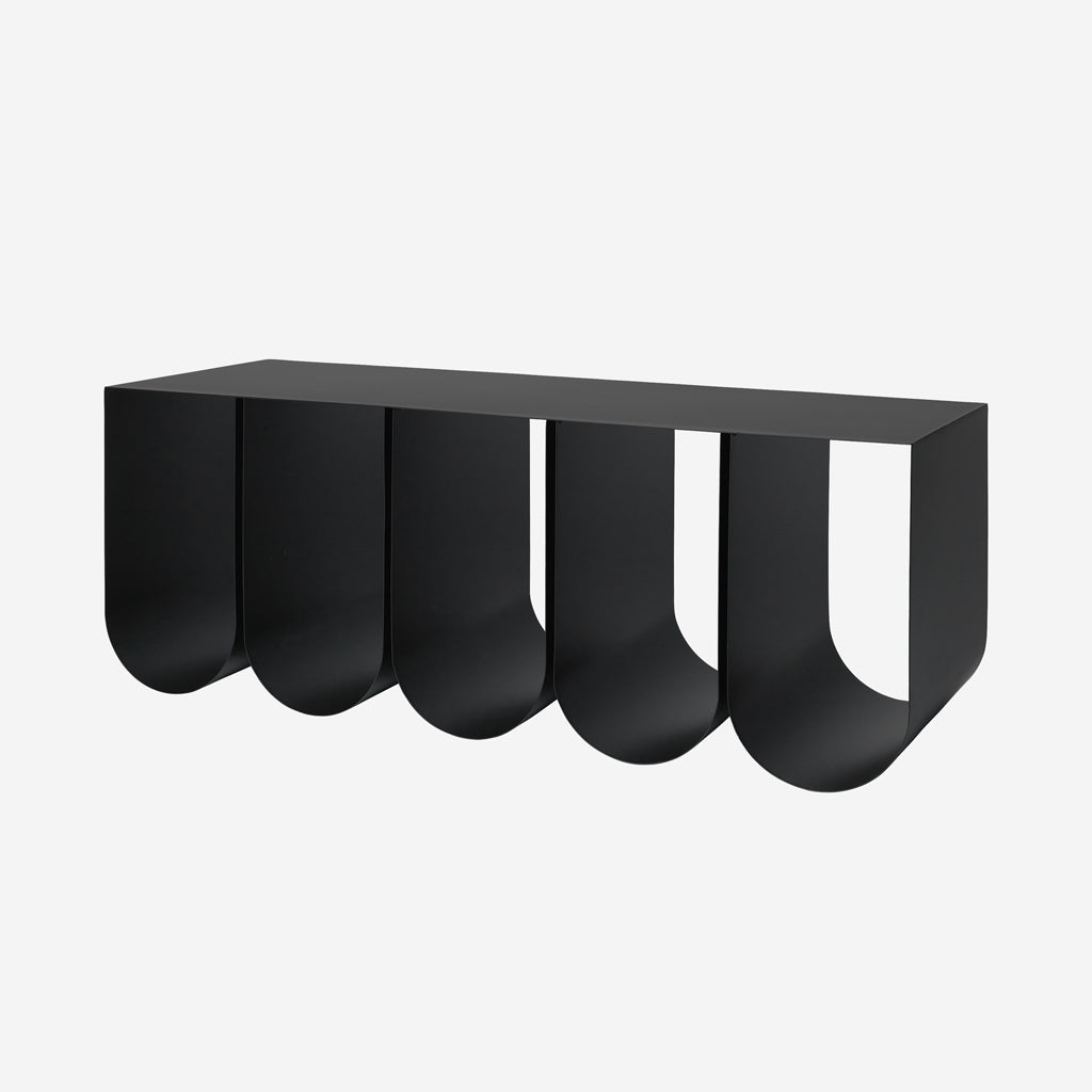 The Curved Bench is a beautiful and timeless extension of the curved side table that combines a sculptural and handcrafted aesthetic. Made of slick black powder coated steel this small side table is also able to store your magazines within its curved base or it can sit confidently on its own as a sculptural centerpiece in a modern home.