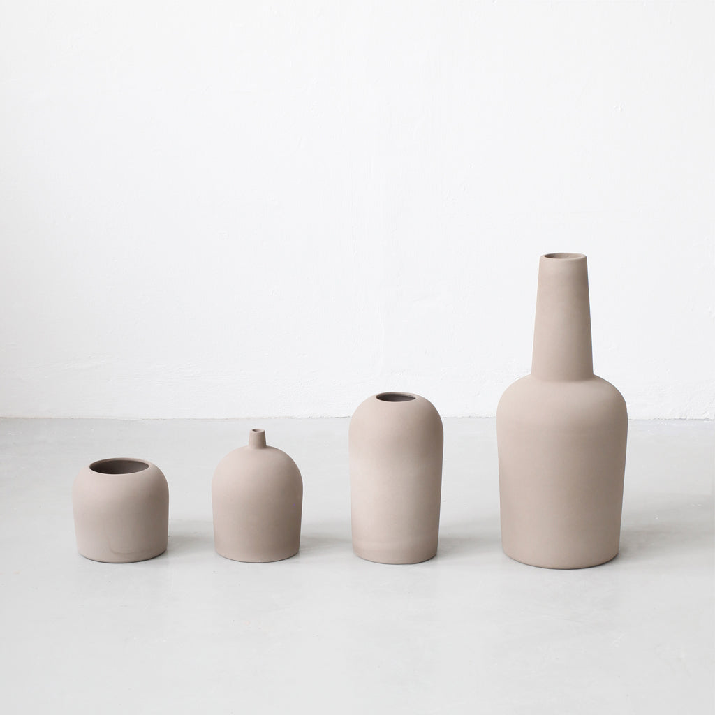 Dome Vases exist in four sizes with four different shapes and vase openings. The vases are made from terracotta with grey engobe. Glazed inside making them waterproof and able to carry living flowers, lavish bouquets or branches. With all four in your home, you’ll always have the perfect vase for any occasion.