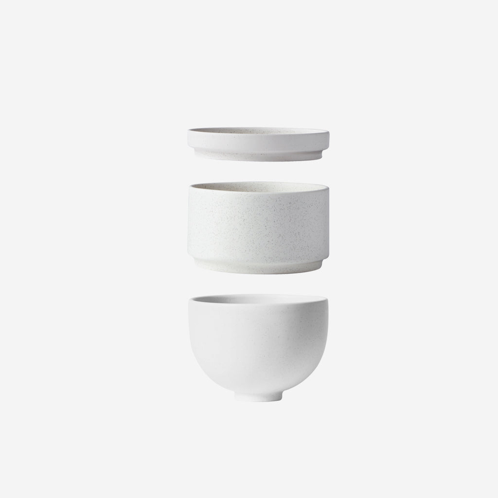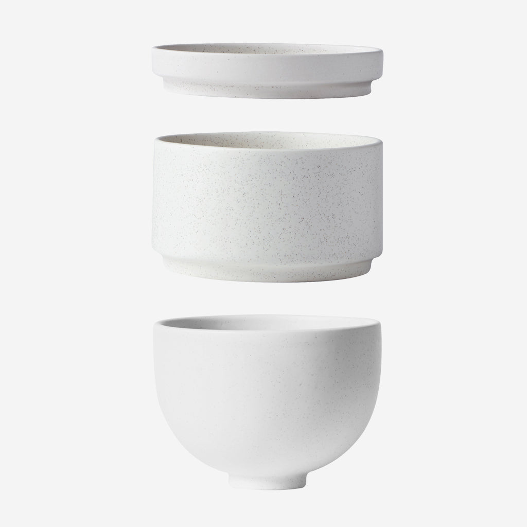 Setomono is an elegant Scandinavian design range of tableware from Kristina Dam Studio. The small Setomono Bowl Set contains three pieces, a small bowl, a container and a matching lid that are stackable, thus creating a sculptural whole. The lid of the set can be used as a side plate when not in use as a lid.