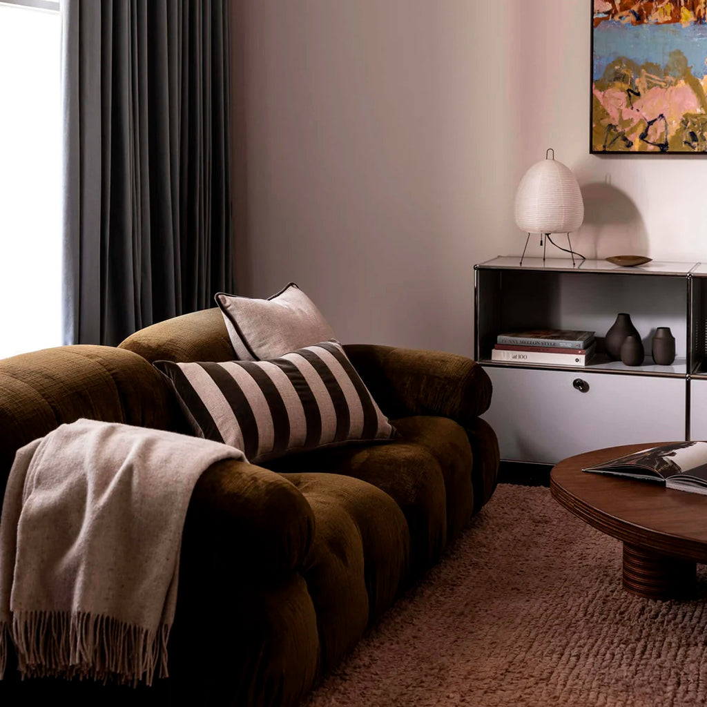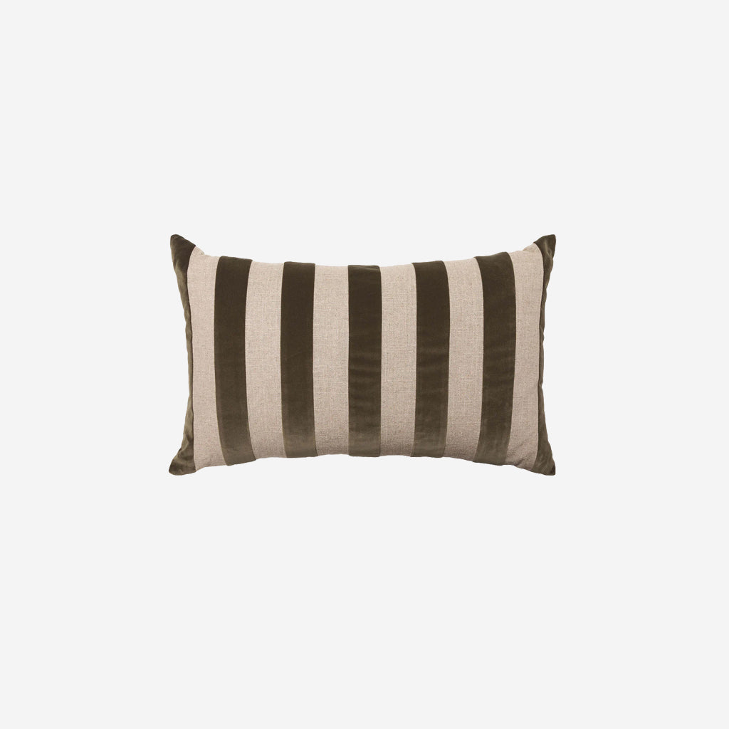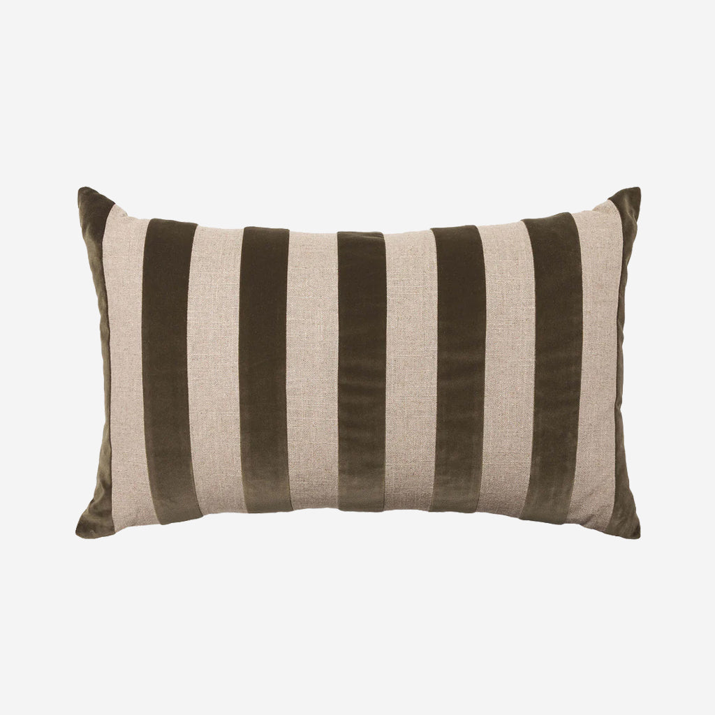 The LM Home Etro Stripe Velvet Cushion in Olive Green is a designer staple, perfect for adding a touch of luxury and texture to any space. Made from a sumptuously soft cotton velvet with alternating natural linen stripes, this chic style statement will bring warmth and texture to any space. Featuring a natural linen reverse and a plush feather insert included.
