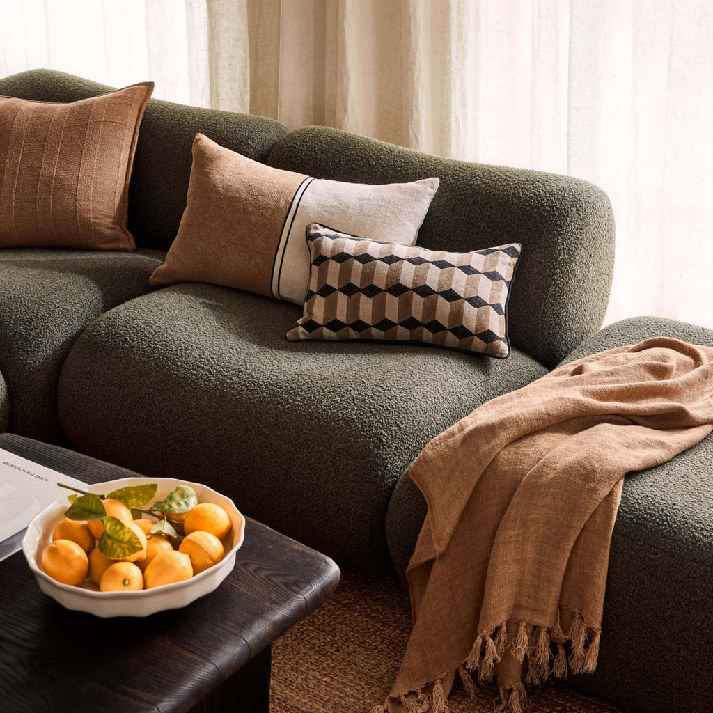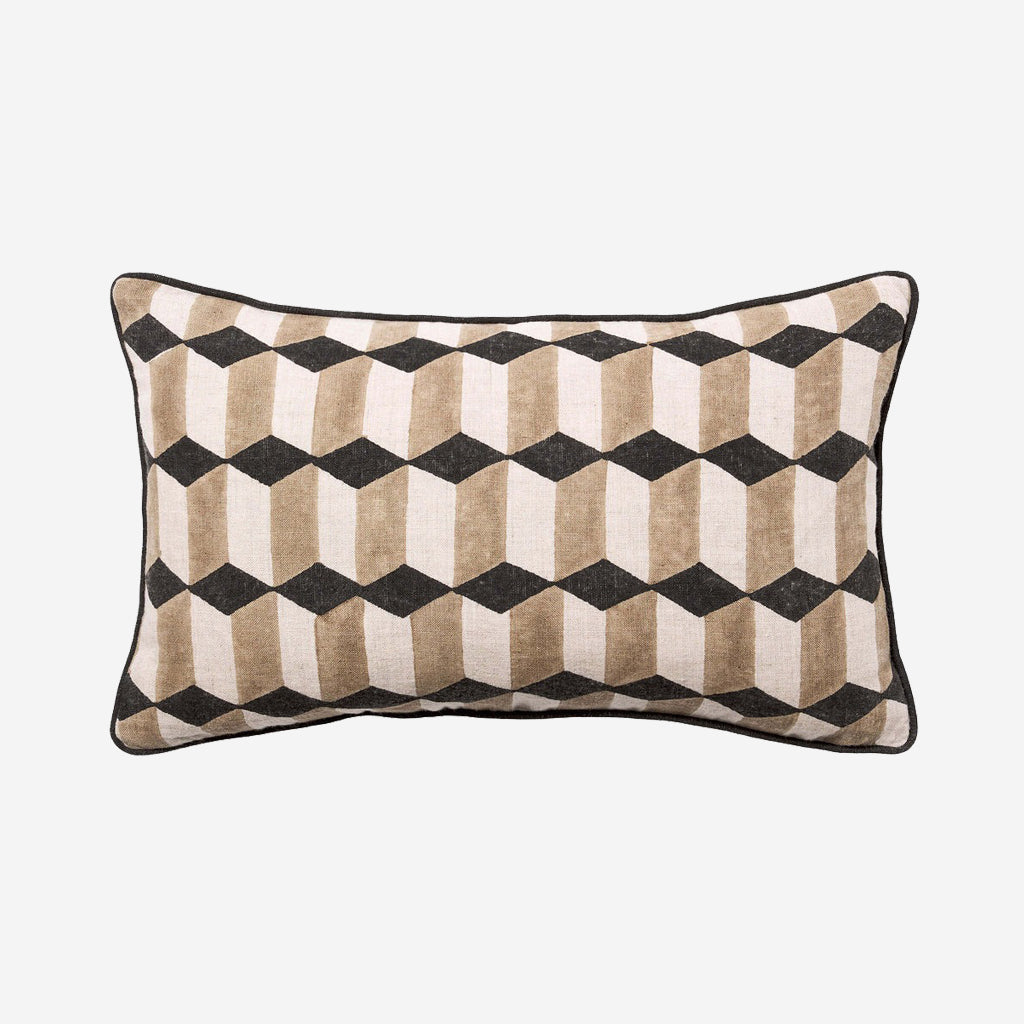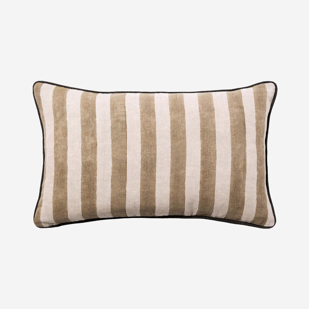 Genoa is hand block printed on quality pure linen and showcases a bold design on the front, with a simple stripe design on the reverse and finished with a solid piped edge.