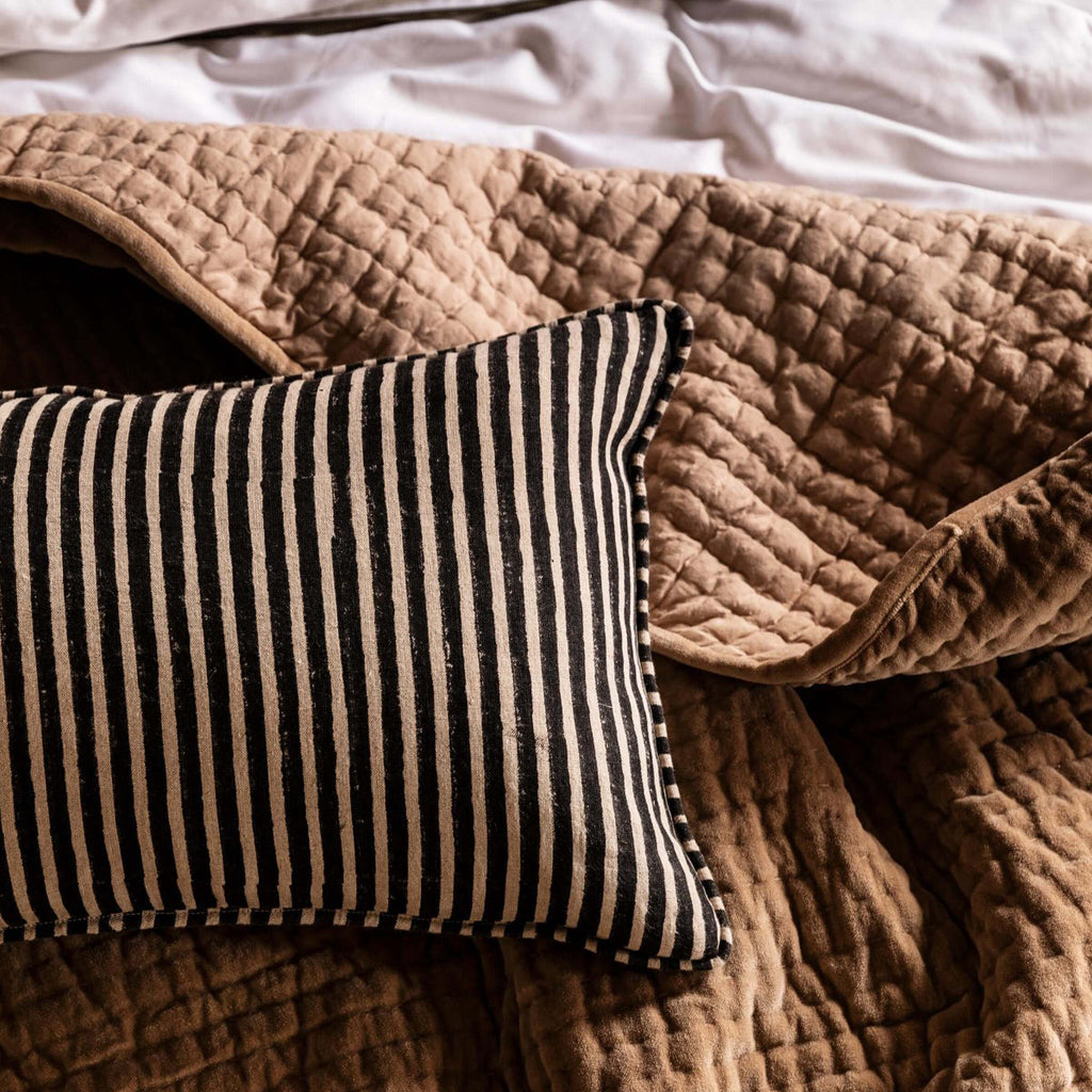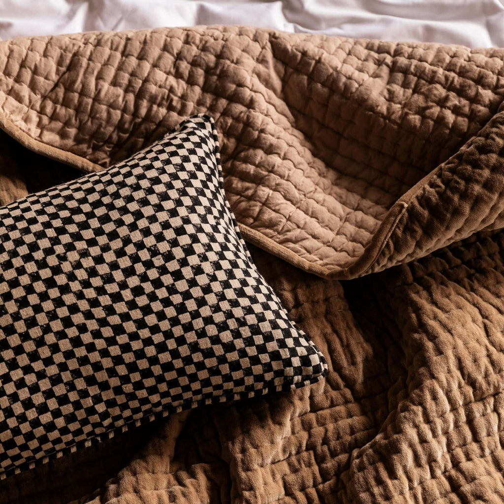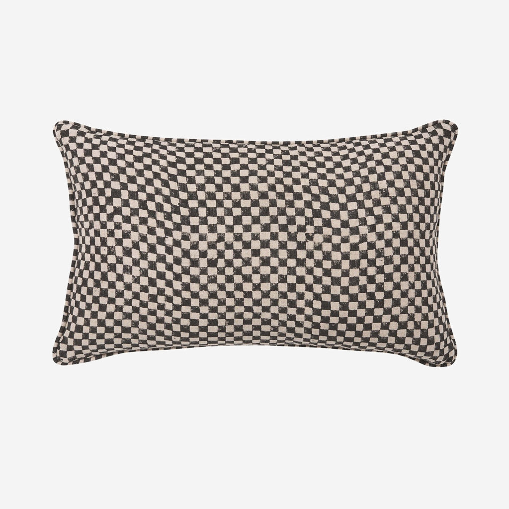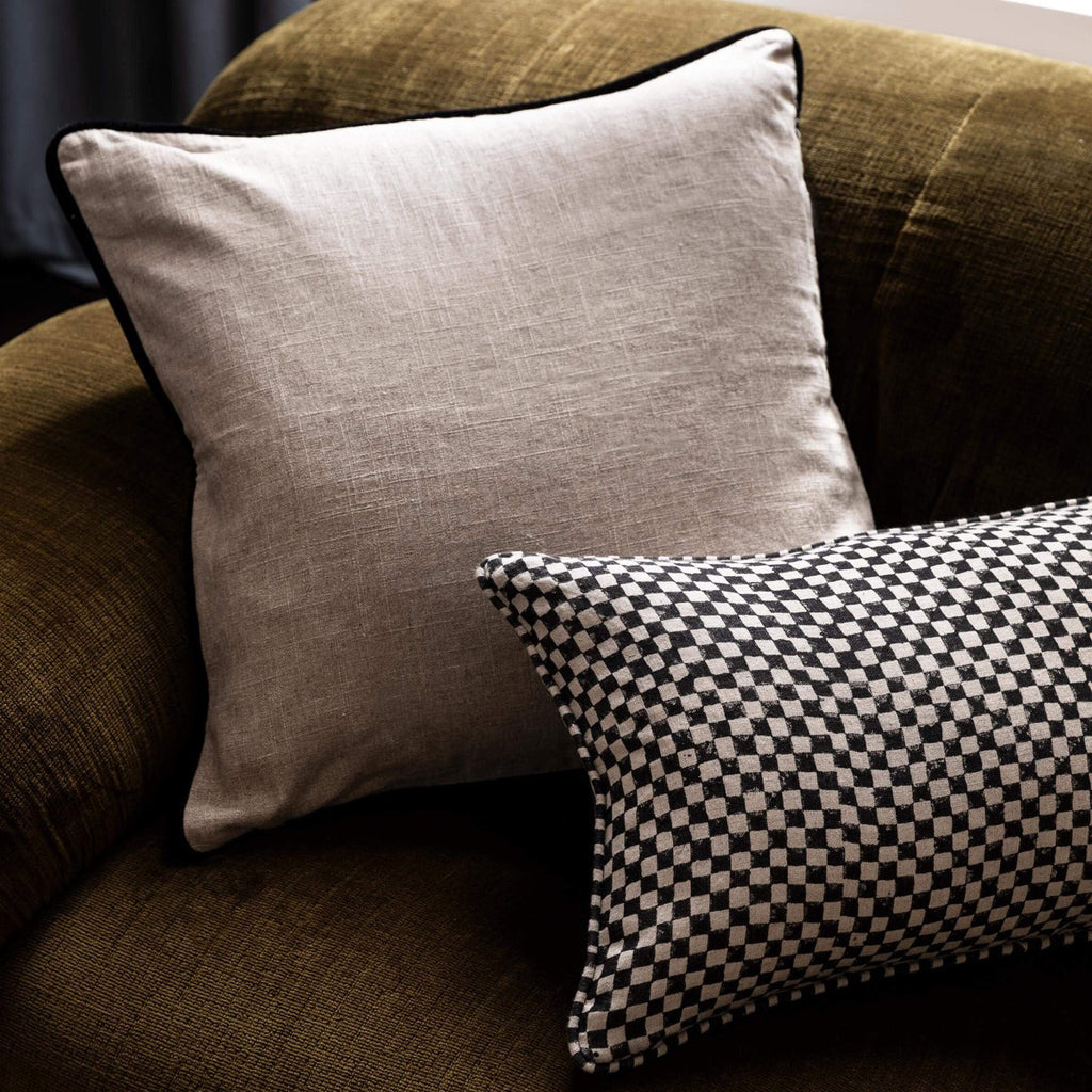 Introduce subtle print into the home with our chequered, hand block printed Gia collection. A testament to craftsmanship and design, each individual item is handmade by highly skilled artisans on 100% linen. Features a reversible design, with a simple stripe piped edge.