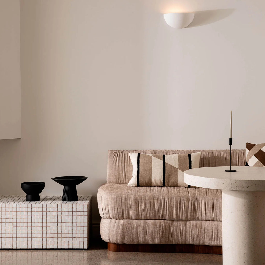 Designed in our Melbourne studio, the Gigi collection features a bold design made with a traditional hand embroidered chainstitch technique. Available in shades of Sky, Chocolate or Latte, these on-trend cushions will be sure to make a style statement. Chainstitch embroidery is a traditional Kashmiri handicraft and important to the local economy. Our striking collection is produced by artisans in remote villages and provides an important supplementary income between harvests. The stitching is done by hand, making each cushion a unique piece of art. Featuring a natural linen reverse and a plush feather insert included.