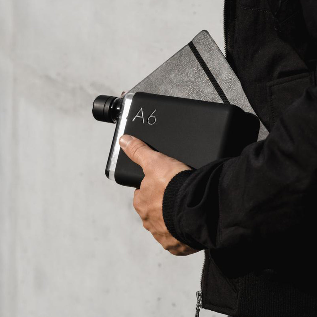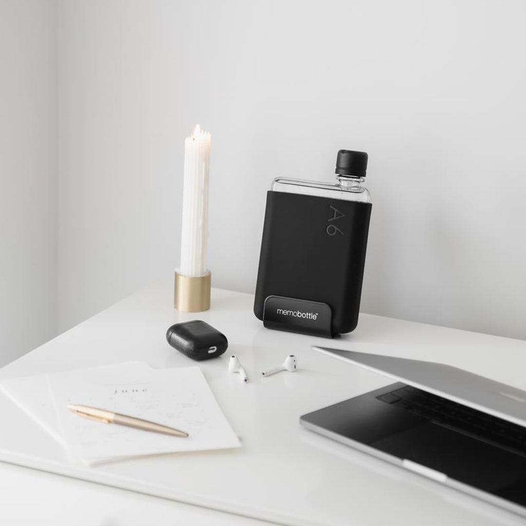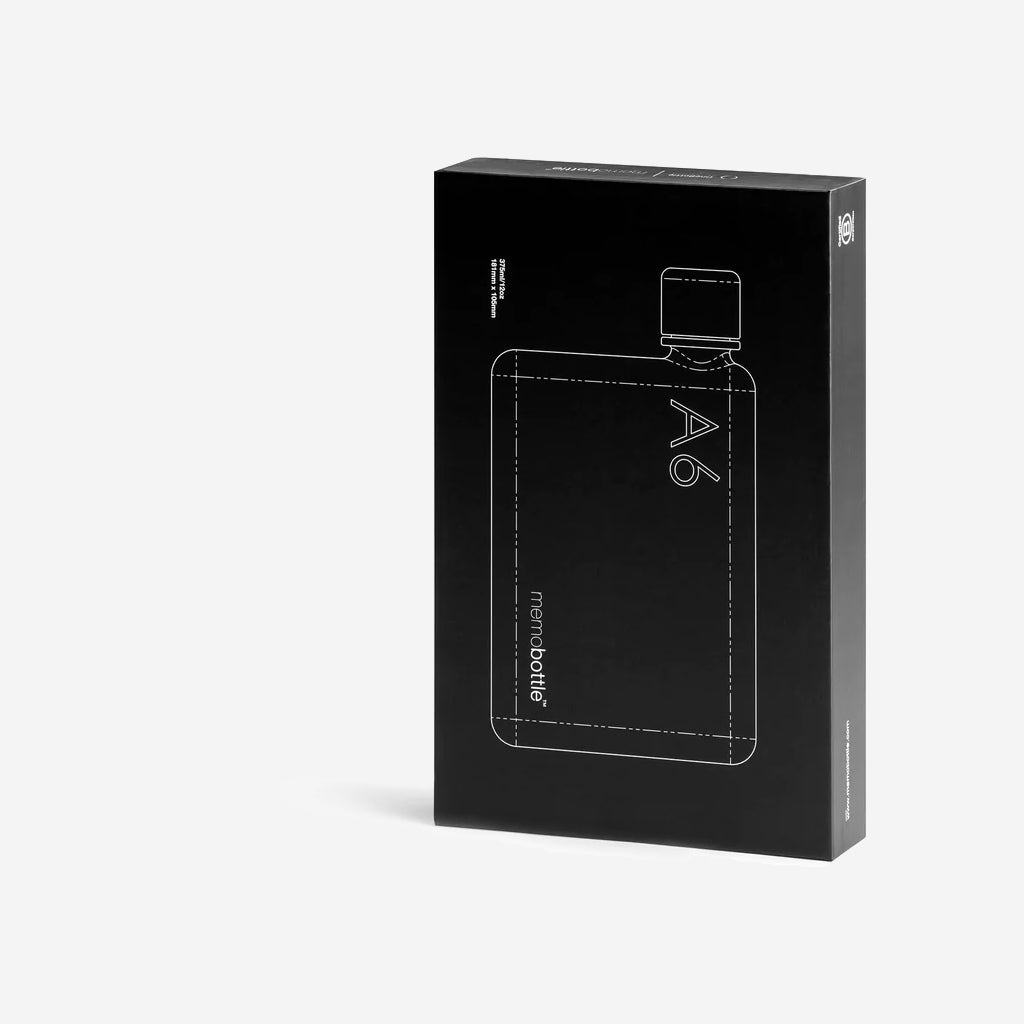 Each A6 memobottle comes with a stainless steel lid and matt black cardboard packaging