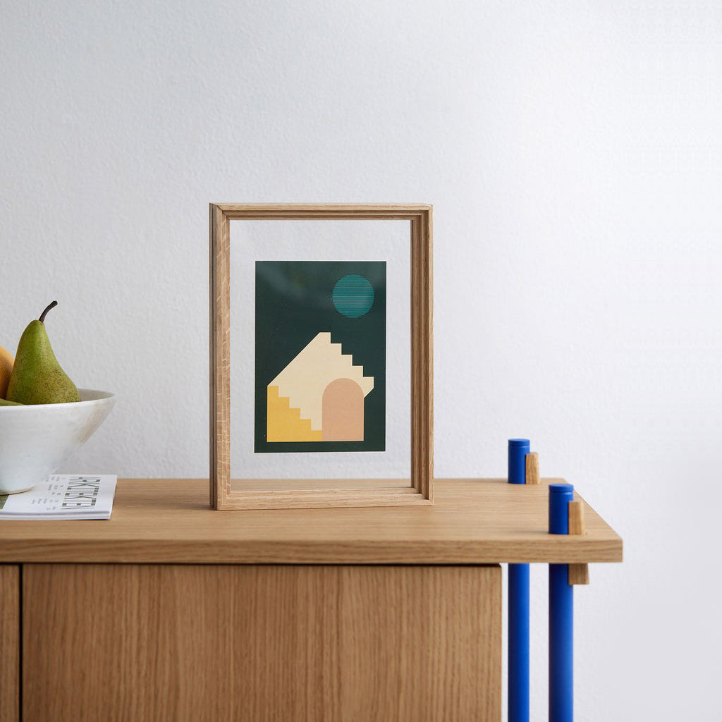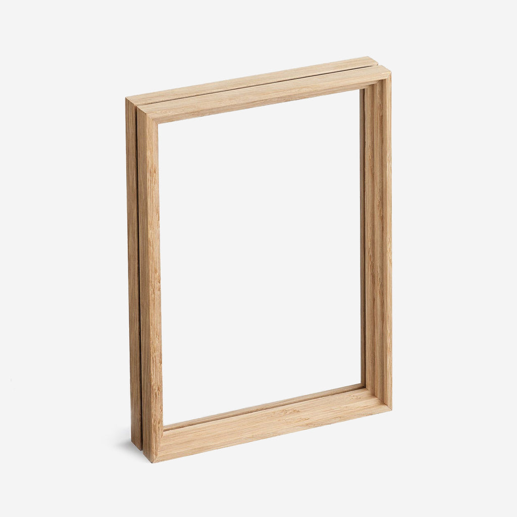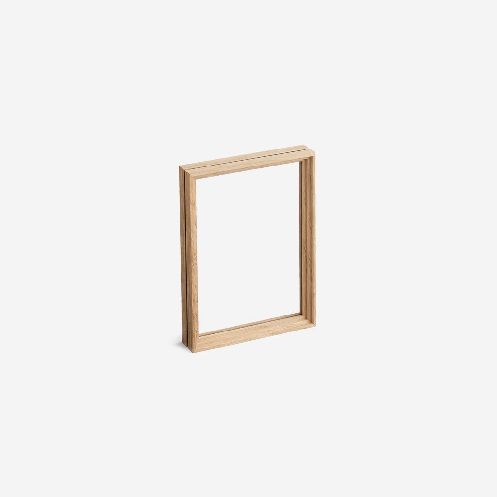 A frame, made simple. Standing Frame comprises two pieces of acrylic glass, four sides, and a rubber band. Suspend photos, flowers, or prints between the transparent glass, or fill out the entire frame. It's up to you.
