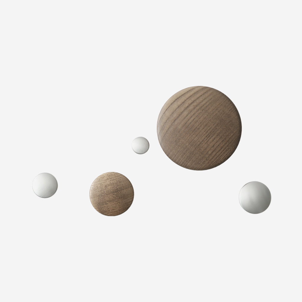 The Dots are versatile wooden hooks in a functional, vibrant design. Taking a playful approach to the conventional coat hook, Dots can be arranged in infinite numbers and combinations in a variety of sizes. Their diverse range of uses makes them practical for both private and professional spaces.