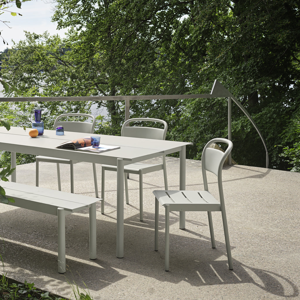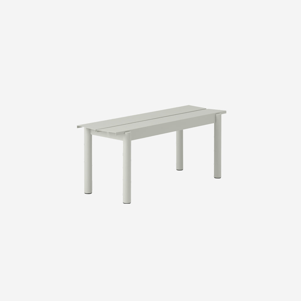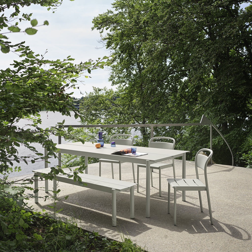 The Linear Steel Bench brings new perspectives to modern outdoor furniture through its straight lines alongside the folded edges, half circular intersecting legs and small spacing for easy removal of water. Kept visually clean for long-lasting aesthetics, the Linear Steel Bench finds it distinct character through subtle detailing and a simple expression, allowing for it to complement any outdoor setting. The Linear Steel Bench is designed in proportions that allows for it to slide easily under the matching Linear Steel Table. Legs come with plastic glides