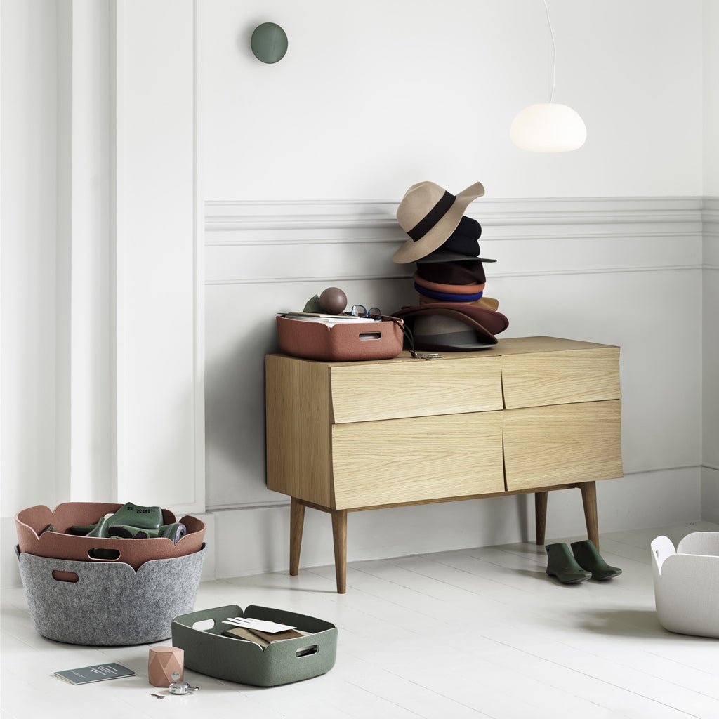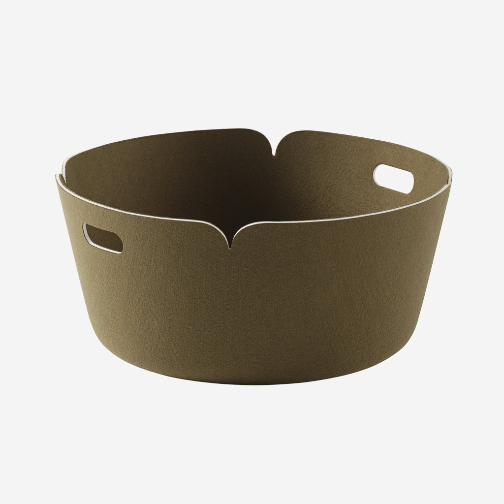 Made from a felt made of recycled plastic bottle fibers, the Restore Round Basket is a functional and versatile storage unit that can be used for almost any object from laundry to blankets to children’s toys.