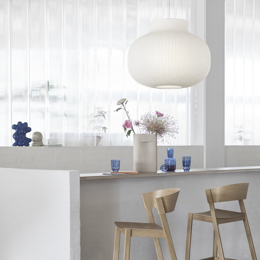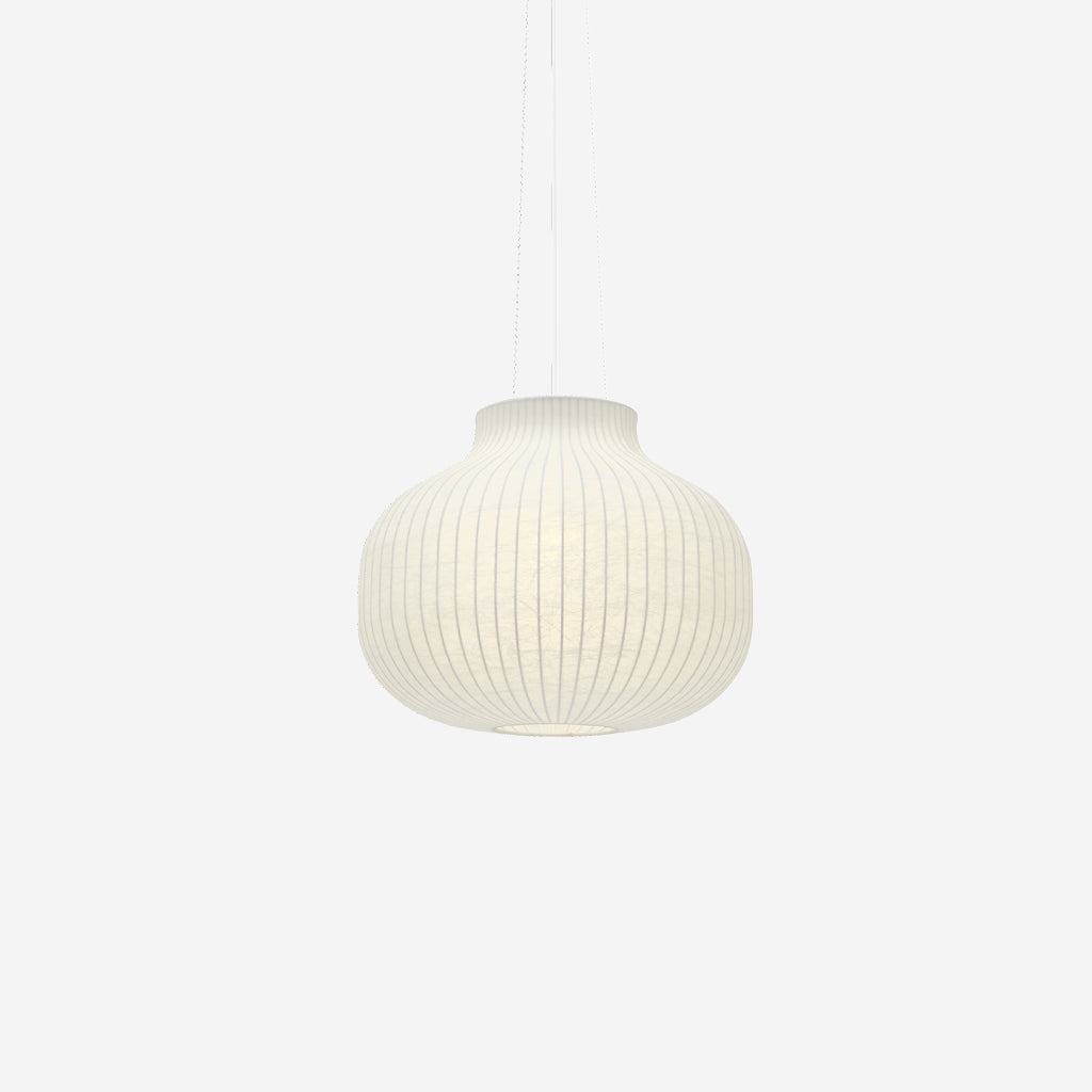 The Strand Pendant Lamp is designed with soft, playful forms for a modern expression. The design provides both diffused lighting and direct lighting, the latter through its top and bottom opening. The design is made in a sprayed cocoon material that consists of tiny strands for a complex, intriguing structure that, paired with its modern form, gives the Strand Pendant Lamp an almost cloud-like appearance. With its cocoon material filtering light through for a warm, comfortable glow, the Strand Pendant Lamp hovers lightly in space, bringing comfort, harmony and a refined sensitivity to any room.